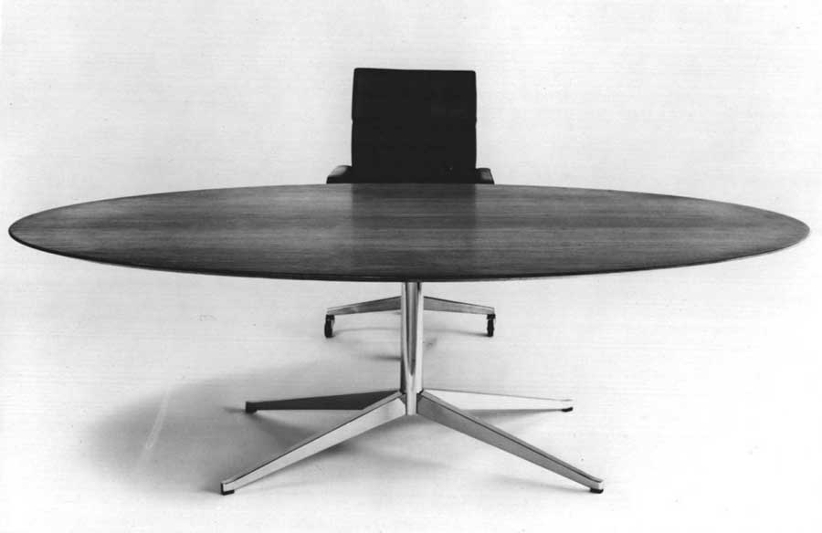 La mayoría de sus primeros diseños son escritorios y credenzas que se utilizan para rellenar espacios en los interiores de la Unidad de Planificación. Uno de sus diseños más conocidos fue una nueva versión de la mesa de conferencias. Reconociendo la necesidad de mejores líneas de visión, utilizó una forma ovalada en lugar de un rectángulo tradicional, Esta mesa ofrece un amplio espacio para reuniones. También demuestra la creencia de Knoll de que los materiales proporcionan suficiente ornamentación. La base de cromo agrega un elemento sorprendentemente moderno que complementa maravillosamente el palo de rosa. No se necesita nada más.