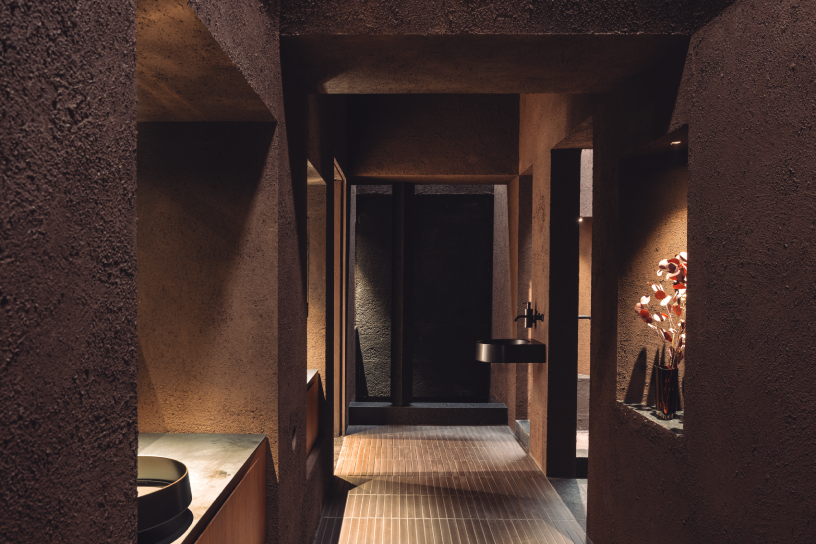 Un espacio dividido en dos zonas: una antesala, que recibe e introduce al visitante y un baño concebido como pieza principal. La antesala funciona como transición, evocando la atmósfera de una habitación de hotel, mientras que el baño se convierte en el foco del diseño.
