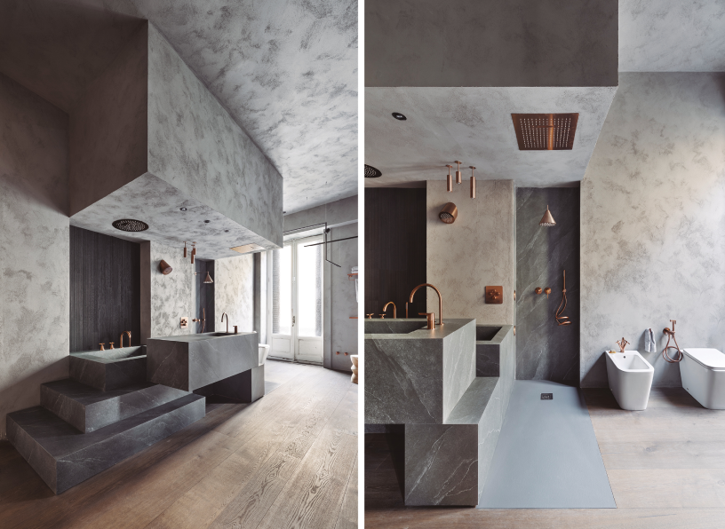 Después, la pausa: la bañera monolítica de piedra se presenta como pieza central, un ofuro reinterpretado, pensado para sumergirse y permanecer. La plataforma escalonada introduce una coreografía lenta: subir, detenerse, entrar. Es la transformación del acto cotidiano del baño en ceremonia.
