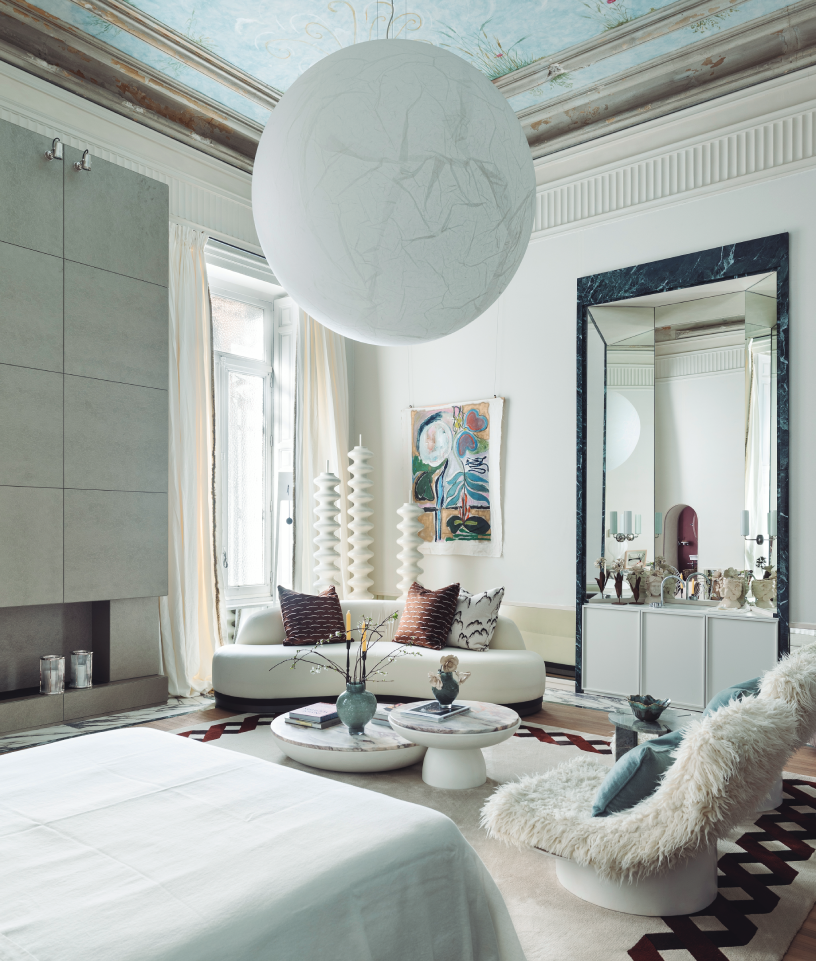 La volumetría escultórica del conjunto reinterpreta la organización del baño. Un espacio de formas redondeadas acentuado por el gran espejo del techo y por las cortinas colocadas en forma circular que provocan un efecto sorpresa y a la vez, íntimo.