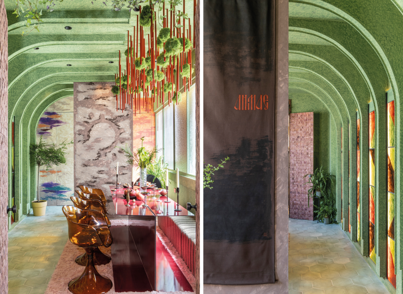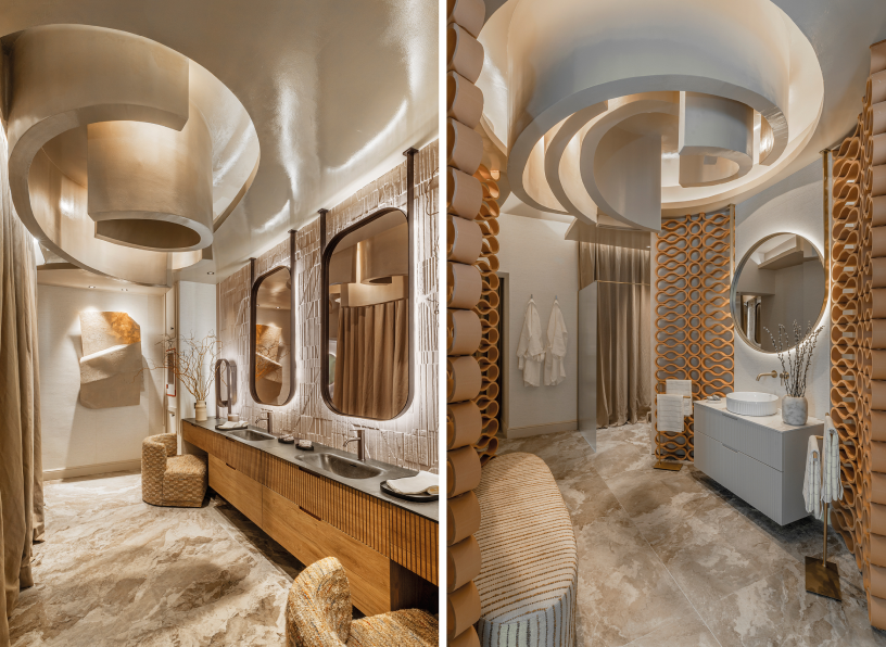 Nada más entrar, el visitante siente la calidez del espacio gracias a la perfilería Annapurna de Tarimatec, la escultura de materiales naturales de Studio Wild Orange, la paleta cromática en tonalidades naturales y el techo de corcho de Diasen. Las formas orgánicas del recorrido, conducen hacia la zona de spa, con papel pintado de Arte y una cama, con ropa de Genix Home, diseñada para tratamientos de belleza y zona de relax; es tiempo para la calma.