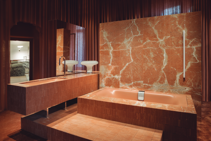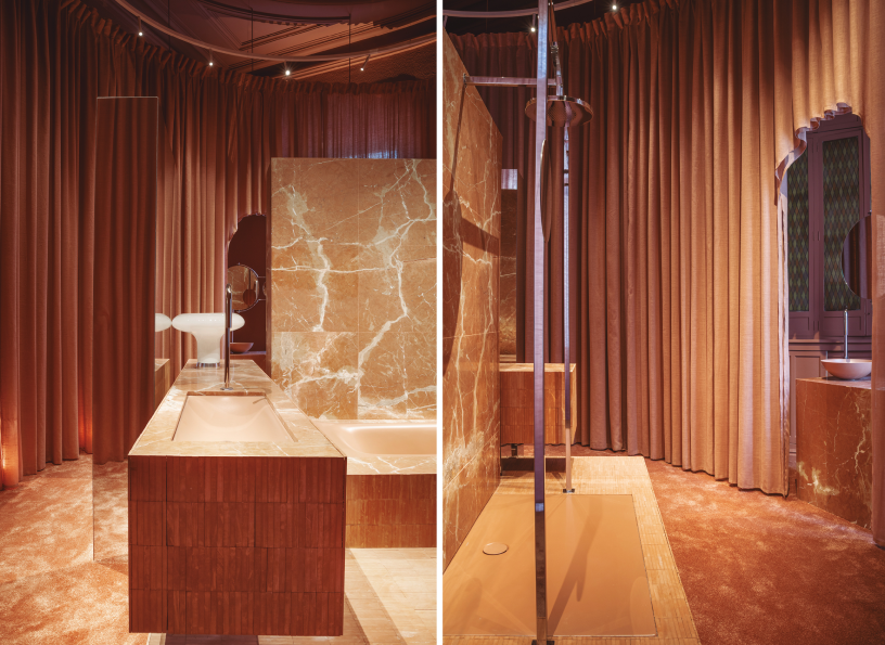 «Fuerza suave» es el Espacio de la firma Kaldewei, un proyecto desarrollado por ILV* Isabel López Vilalta que crea un diálogo de contrastes entre lo femenino y lo industrial. Tonos terracotas, formas delicadas, textiles que representan la feminidad, en contraste con la materialidad industrial aportada por el revestimiento de mármol rojo Levante de Cupa Stone y la cerámica de Cevica.