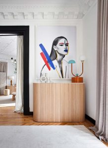 «Nuestra querida Cleo quedaba representada a través de la impactante fotografía «Pop Sixties» de Yellow Korner, una mujer vanguardista que disfruta del salón de baño que hemos creado», nos cuentan en el estudio. Es una obra de Nicolas Guérin, famoso sobre todo por sus retratos de estrellas, a los que añade trazos con rotulador, pintura o marcador.