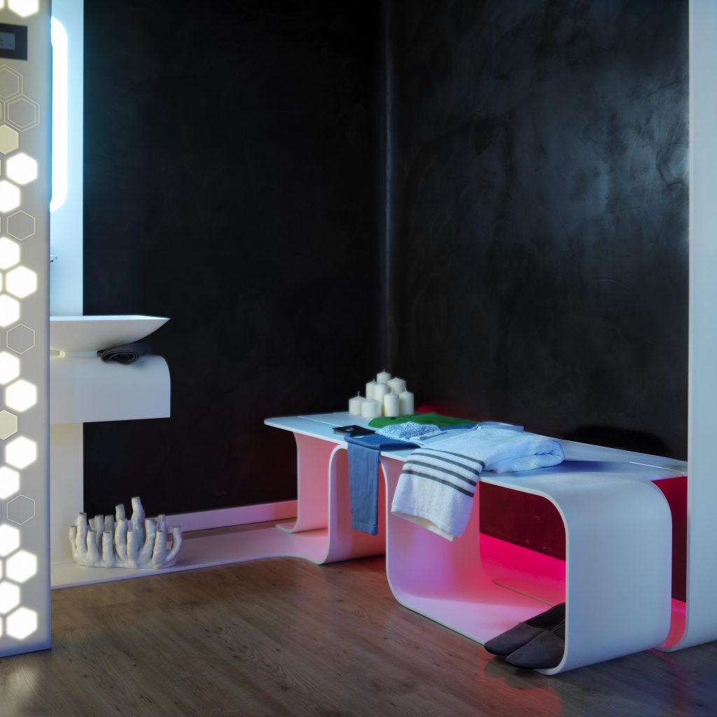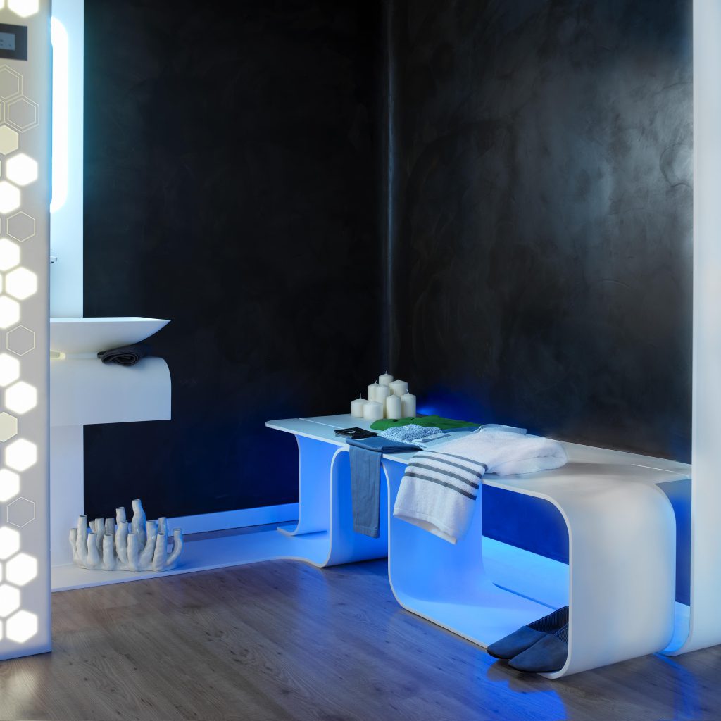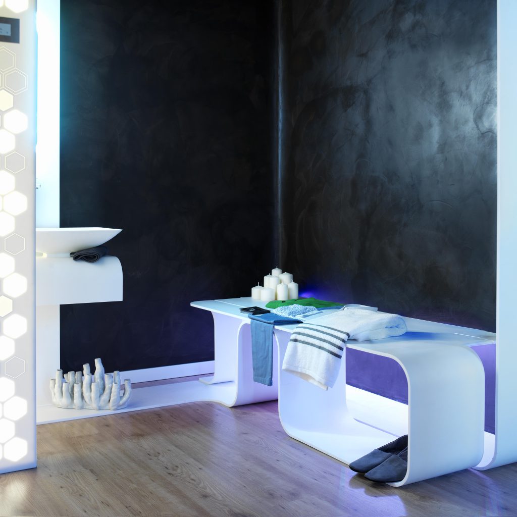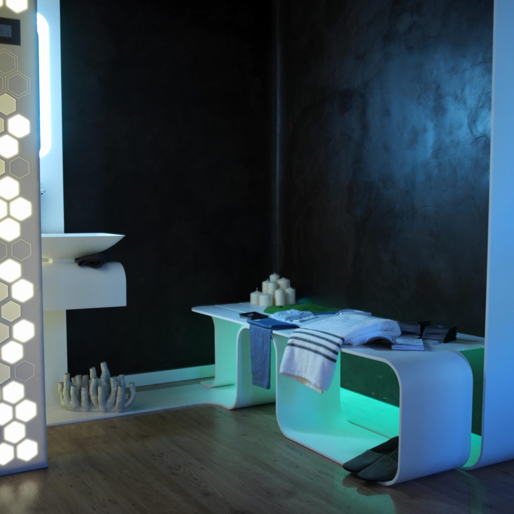 Cada vez más necesitamos momentos en los que desconectar de la rutina, del estrés y de la vida acelerada a la que la sociedad nos empuja. Un programa de equipamiento creado a medida del entorno, y de uno mismo. Su geometría continua permite moldear el espacio dando vida a las diferentes estancias, creando una escultura visual armónica y única para cada intervención: hammam, cromoterapia, área lluvia, área baño, zona de meditación… Esta lengua de mobiliario se integra en un entorno de piedra y madera, elementos naturales que ayudan a equilibrar la mente, y el cuerpo. El sistema audiovisual complementa el espacio, creando un ambiente burbuja que nos aísla y nos permite reencontrarnos con nosotros mismos.
