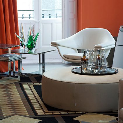 Con gran presencia en el espacio, disfrutamos de un revestimiento mural textil de exquisita delicadeza, que nos habla de Babilonia, una ciudad de la baja Mesopotamia donde surgió la ganadería y la agricultura trayéndonos así, reminiscencias a los relieves que esta civilización representaba en sus templos, denominados zigurat.