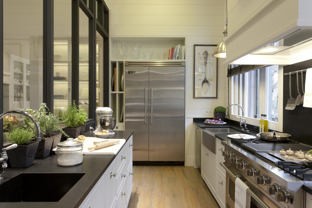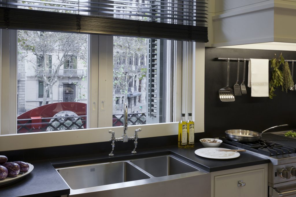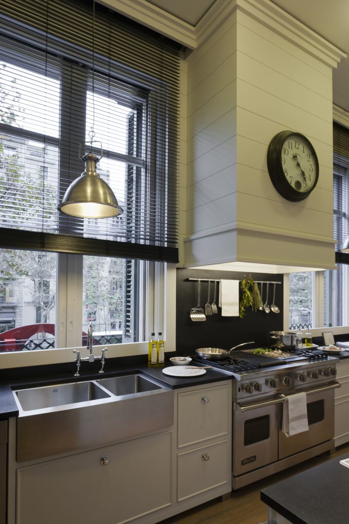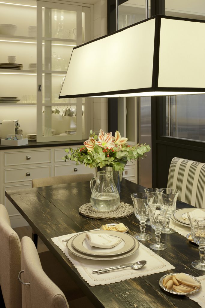 Cuando Chone y yo vimos el espacio, enseguida pensamos que era el idóneo para desarrollar un bonito proyecto. Nos planteamos así una distribución compartimentada pero con transparencias. La gran mampara central divide y organiza el espacio: zona de cocinar, amplio comedor de diario, despensa y un espacio anexo de cuarto de lavar y planchar. El blanco y el negro han sido los colores dominantes. Sin perder la practicidad y tecnología habituales en nuestros trabajos, en esta ocasión le hemos dado la imagen elegante, sobria y acogedora del mobiliario muy tradicional americano.