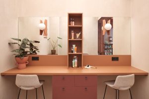 El mobiliario se realizó a medida, diseñado exclusivamente para esta tienda. Las piezas, además de funcionales, ayudan a destacar los productos cosméticos sin sobrecargar el ambiente. Las proporciones, los acabados y los materiales fueron elegidos para crear un conjunto equilibrado que no distrae, sino que acompaña.