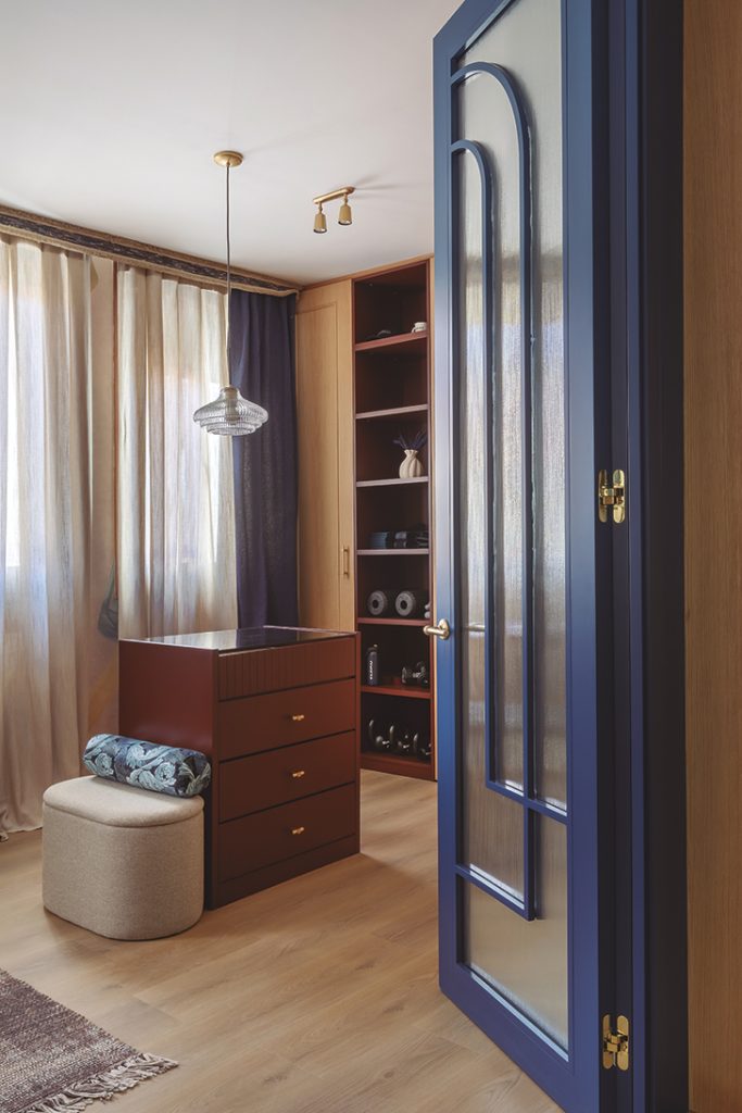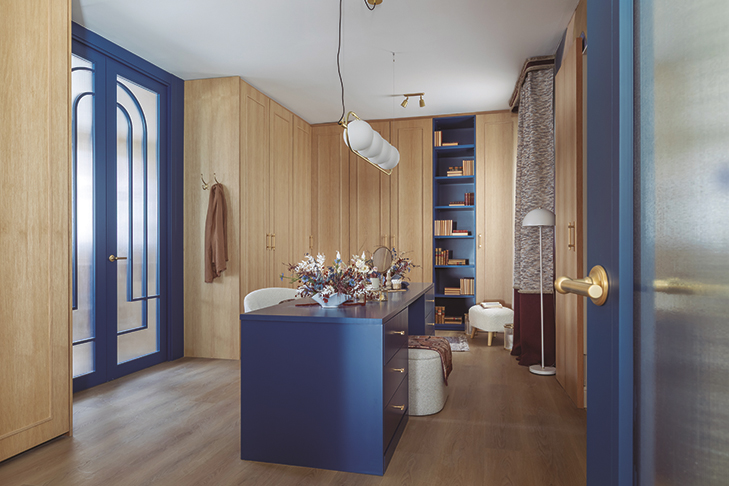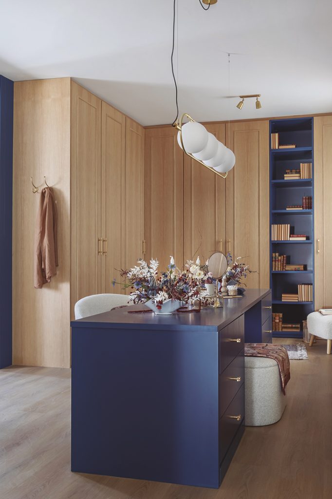 TENDENCIAS, INNOVACIÓN Y MATERIALES. El roble envuelve el espacio con calidez natural, los tonos azules aportan serenidad y los granates añaden profundidad y carácter. Las islas crean pausas dentro del recorrido, mientras la puerta de cristal conecta las estancias con fluidez, ampliando la sensación de espacio y continuidad.