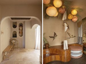 Otro ejemplo fue «El Nido«, el espacio conceptual de Studio Lemon, donde se utilizaron placas de arcilla con fibras vegetales y malla de yute. Estas placas, aplicadas en trasdosados y tabiques, ofrecían un acabado especialmente envolvente y táctil, perfecto para un ambiente que quería evocar refugio y recogimiento. Además, aportan beneficios como la reducción de olores, la neutralización de tóxicos y un excelente comportamiento térmico.