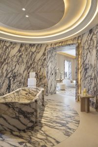 Más de 3.500 piezas fueron colocadas con precisión para formar este mural que juega con texturas y relieves. La colección Fior di Viola 4D, desarrollada con tecnología 4D Ceramics de Iris Ceramica Group, destaca por extender el diseño hasta el propio espesor del material, visible en encimeras, bañeras, marcos y zócalos del espacio.