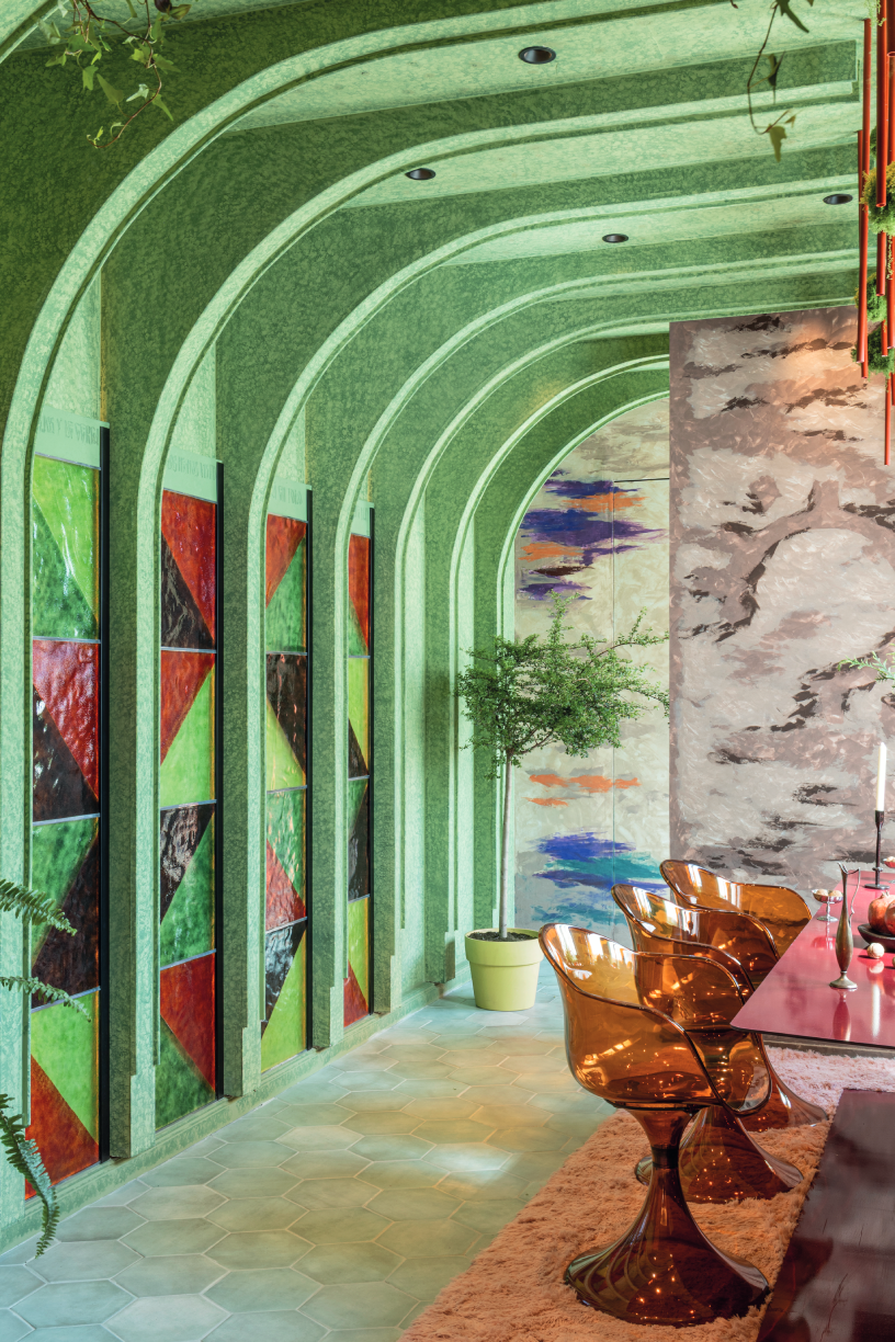 Separando ese espacio de introspección del patio, el panel divisorio Aura de Sidón. Una pieza que toma como referencia el arco tradicional y lo reinterpreta con un lenguaje contemporáneo. Sus líneas suaves permiten que la luz fluya y creen una continuidad visual que conecte los ambientes, aportando fluidez sin perder la personalidad arquitectónica. El panel integra un núcleo de aluminio que garantiza precisión y estabilidad, acabado en verde, un tono que suma carácter y naturalidad al conjunto.