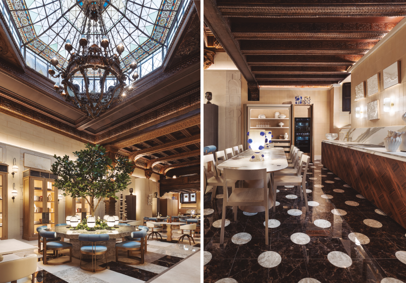 Esta relación entre cerámica y madera se materializa en la barra de bar y en las librerías. La barra es una pieza a medida que integra el rechapado en Pomelé Frisé con superficies de Jatoba Brown 4D de Iris Ceramica Group. Las librerías, por su parte, destacan por su minuciosa trabajo de marquetería de maderas cosidas a mano, técnica que genera texturas visuales exclusivas sobre la superficie, en el que se ha incorporado el material Jatoba Brown de Iris Ceramica Group en la parte superior y los tiradores.