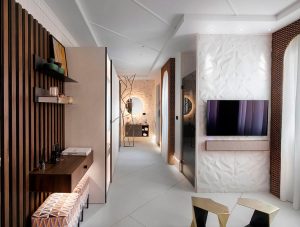 En el apartamento «Tegar Urban Stay«, de Casa Decor 2022, el interiorista Jose Lara demostró que incluso en 24 metros cuadrados hay lugar para un área de bienvenida. La clave: muebles modulares y polivalentes, como una consola que también puede funcionar como escritorio.