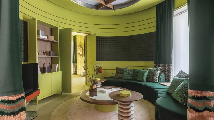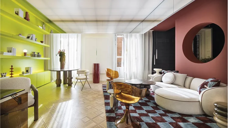 Nuestro espacio es una zona lounge inspirada en la naturaleza, donde encontrarás materiales de la tierra como la piedra, presente en el papel y en los mármoles; árboles y ramas, en las lámparas, y aves en el cielo evocadas por el papel del techo. Hemos combinado sofás de estilos diferentes con diseños propios, como el aparador y la mesa, piezas escultura que juegan con las formas redondas y los distintos materiales y alturas, y que aportan la nota de exclusividad al diseño. Una propuesta atrevida, donde el dorado de molduras y estanterías voladas es el hilo conductor de la decoración.