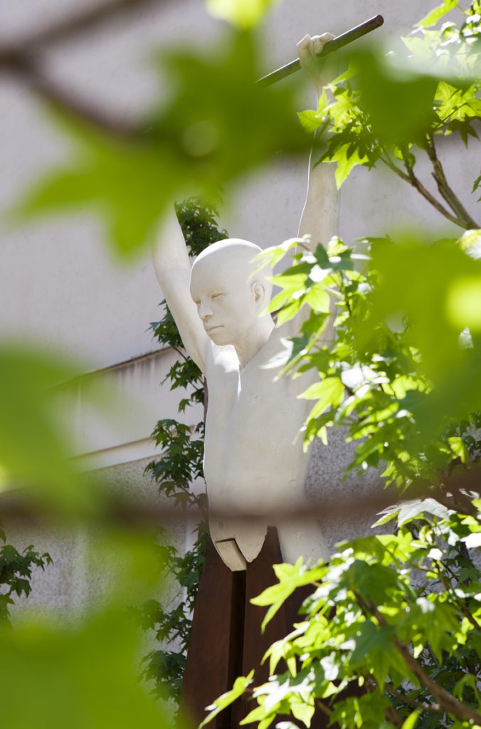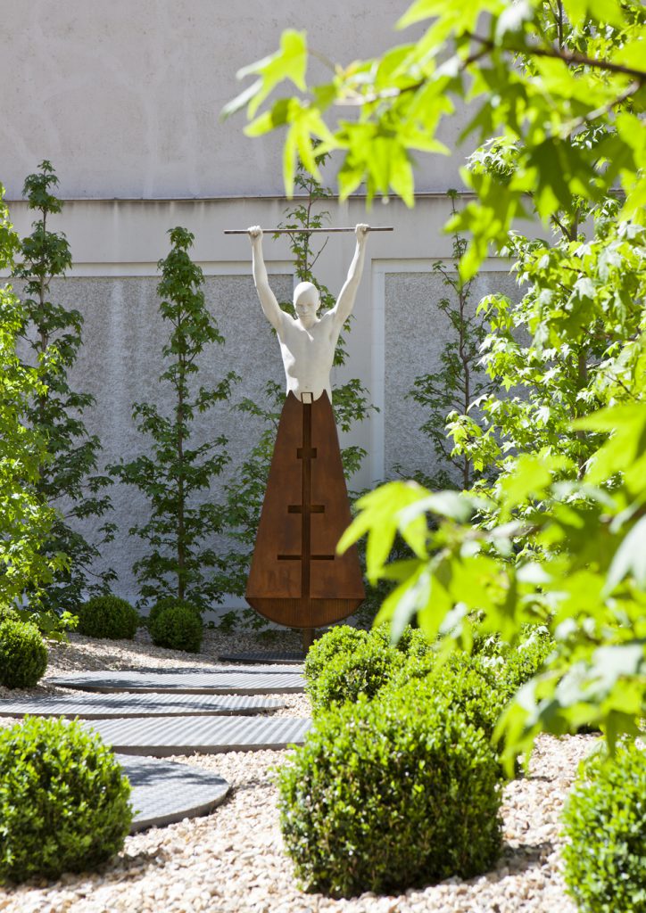 “Bosque urbano con un diseño orgánico, sencillo y ordenado. El arbolado abraza la escultura de vanguardia en un ambiente fresco, ideal para crear un rincón de campo en medio de la ciudad. La parte baja del bosquecillo tiene un salpicado de bolas verdes a juego con los círculos metálicos del paso. La gravilla decorativa remata el jardín con sobriedad y sencillez.”