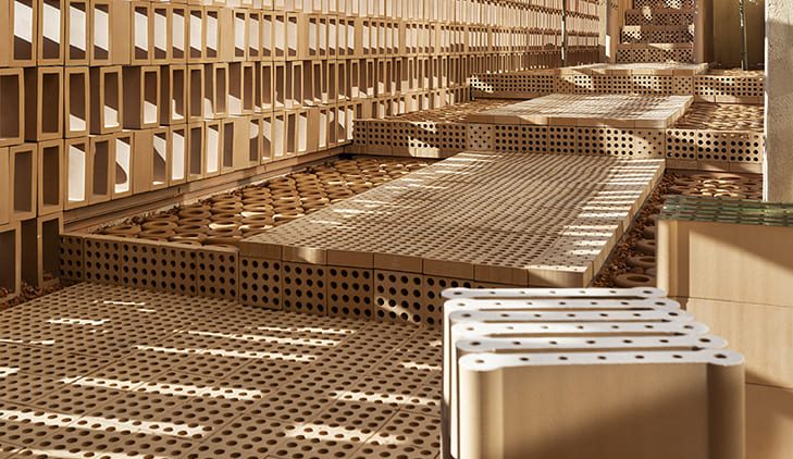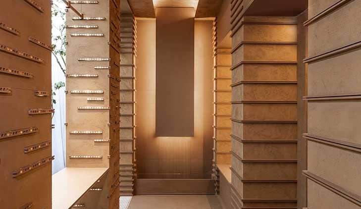 El bambú en sus diferentes estados –techos acústicos, tableros contrachapados, pavimentos exteriores, los parquets balterio y el revestimiento mineral Megapan–nos dan el lenguaje, la sensación: el contacto con los materiales.