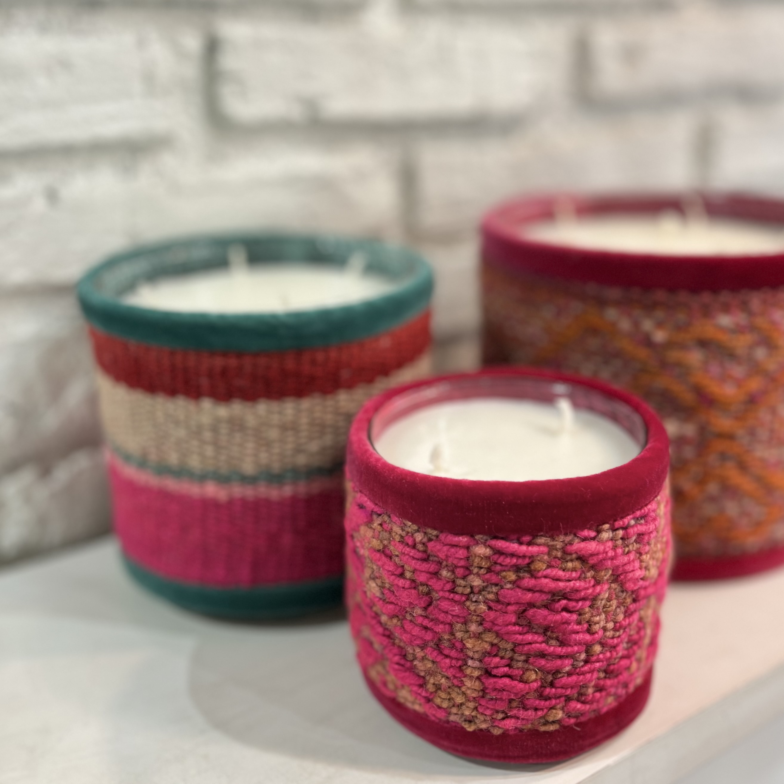 Velas y portavelas recubiertas con telares artesanales en colores naturales y vibrantes. Piezas de decoración esenciales y atemporales para crear una atmósfera envolvente que favorece la calma y da importancia a los detalles.