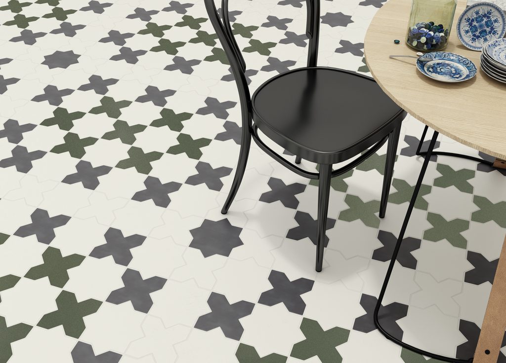 NEW YORK 13,6x13,6 cm es una colección singular formada por 3 formatos que encajan entre si: Estrella, Cruz e Inserto, para hacer ambientes con la cruz solo. Está fabricada en gres por lo que sirve para pavimentos interiores. Disponible en 8 colores mate antideslizantes y también con la posibilidad de personalizar, como en el ambiente hecho en Casadecor.