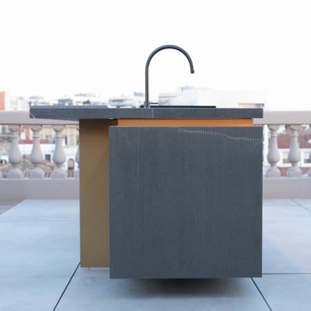 Cocina de exterior de lujo. Novara ha creado un concepto icónico, una pieza escultural sin precedentes. Con una superficie mineral esculpida, que crea un acanalado perfecto, las formas de la N3 evocan un monumento o una obra de arte con un diseño puro y hermoso.