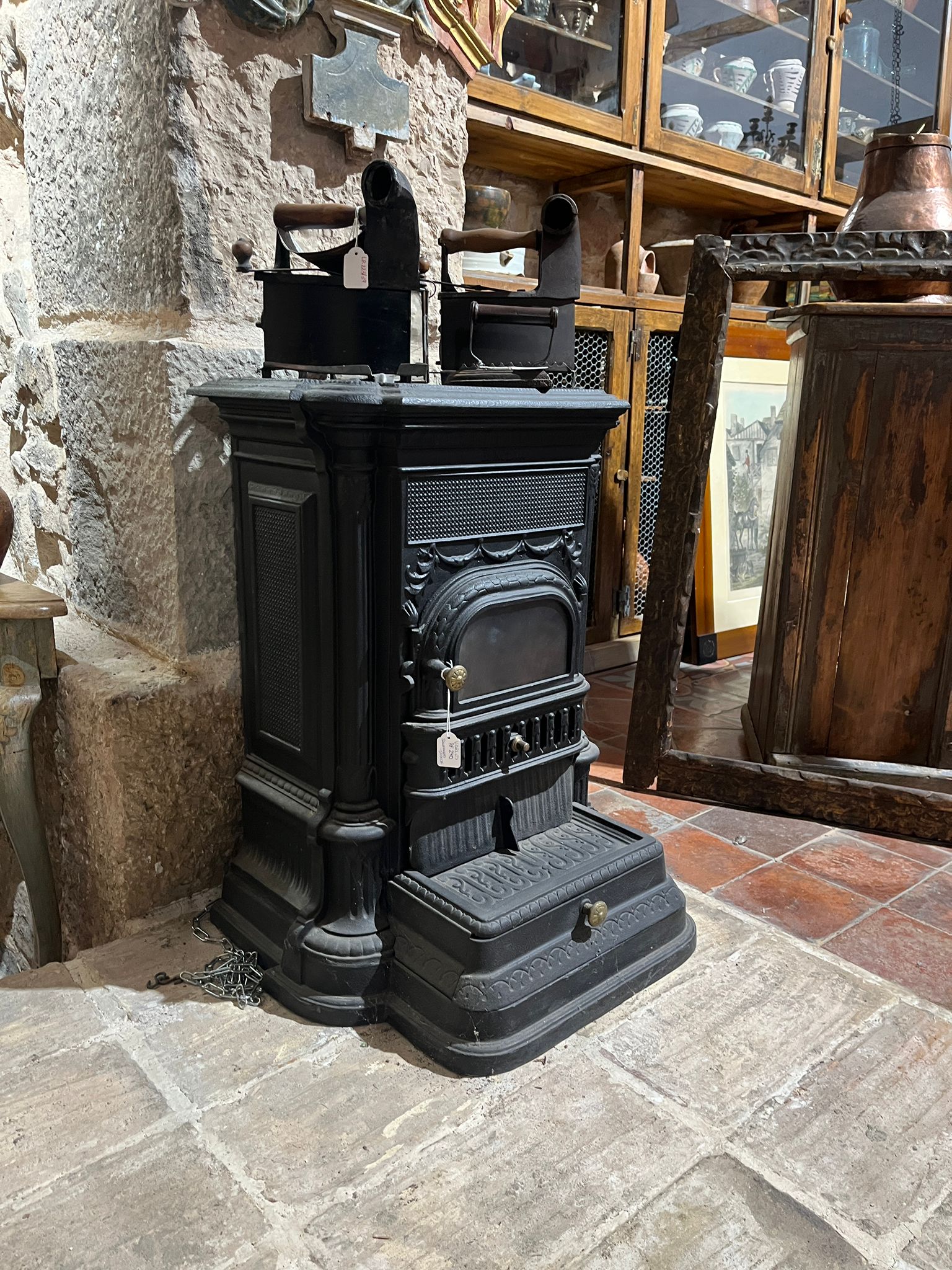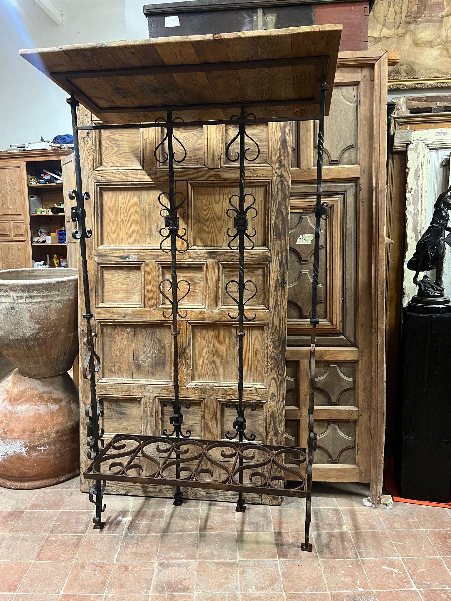 Pieza de diseño, elaborada a partir de elementos antiguos. Concretamente se han utilizado hierros del forja del siglo XVII de dos tipos, uno de ellos empleado antiguamente en una escalera y el otro como reja de ventana. Como base de banquito se ha empleado un antepecho de ventana y para el tejado tarima recuperada de derribo.