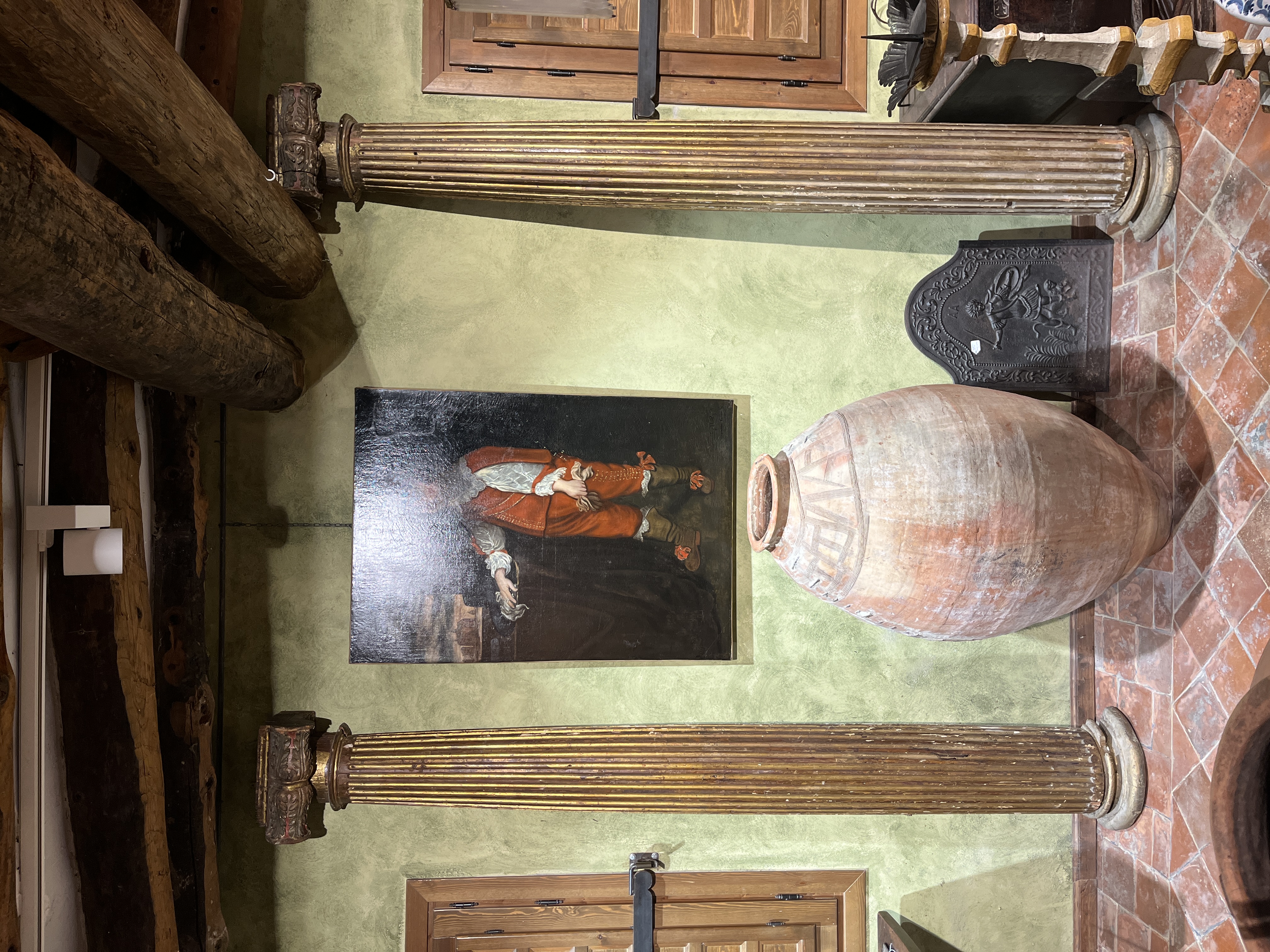 Columnas de pared del siglo XVII, con capiteles de estilo jónico adornados con delicadas tallas de hojas de acanto y restos de policromías en rojo y verde, el resto de las columnas son de pan de oro y se alzan casi hasta los 3 metros de altura.