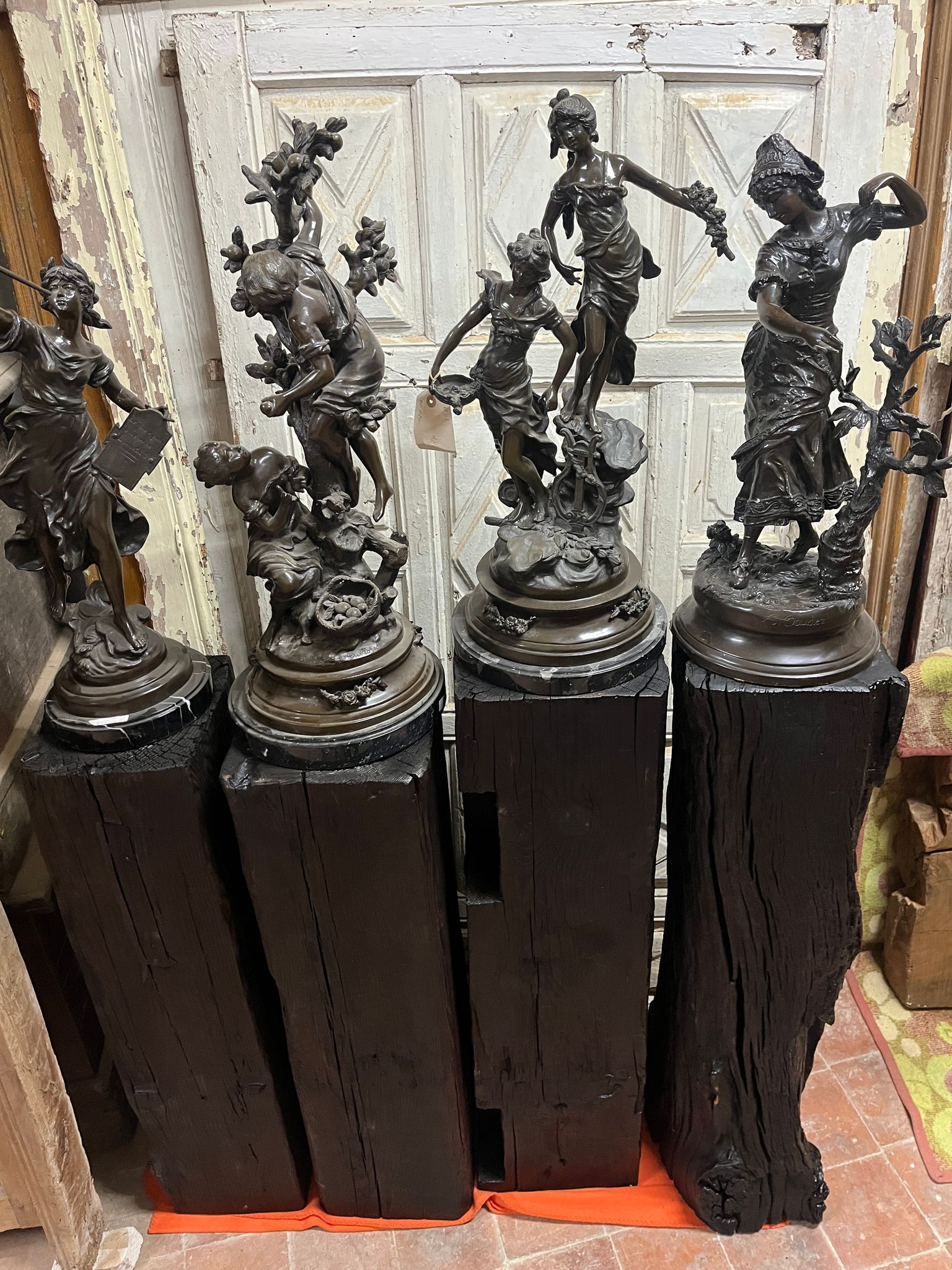 Conjunto de cuatro figuras de bronce de finales del siglo XIX. Vestidas con unas imponentes peanas elaboradas con madera antigua recuperada y quemada mediante la técnica del Yaquisugui.