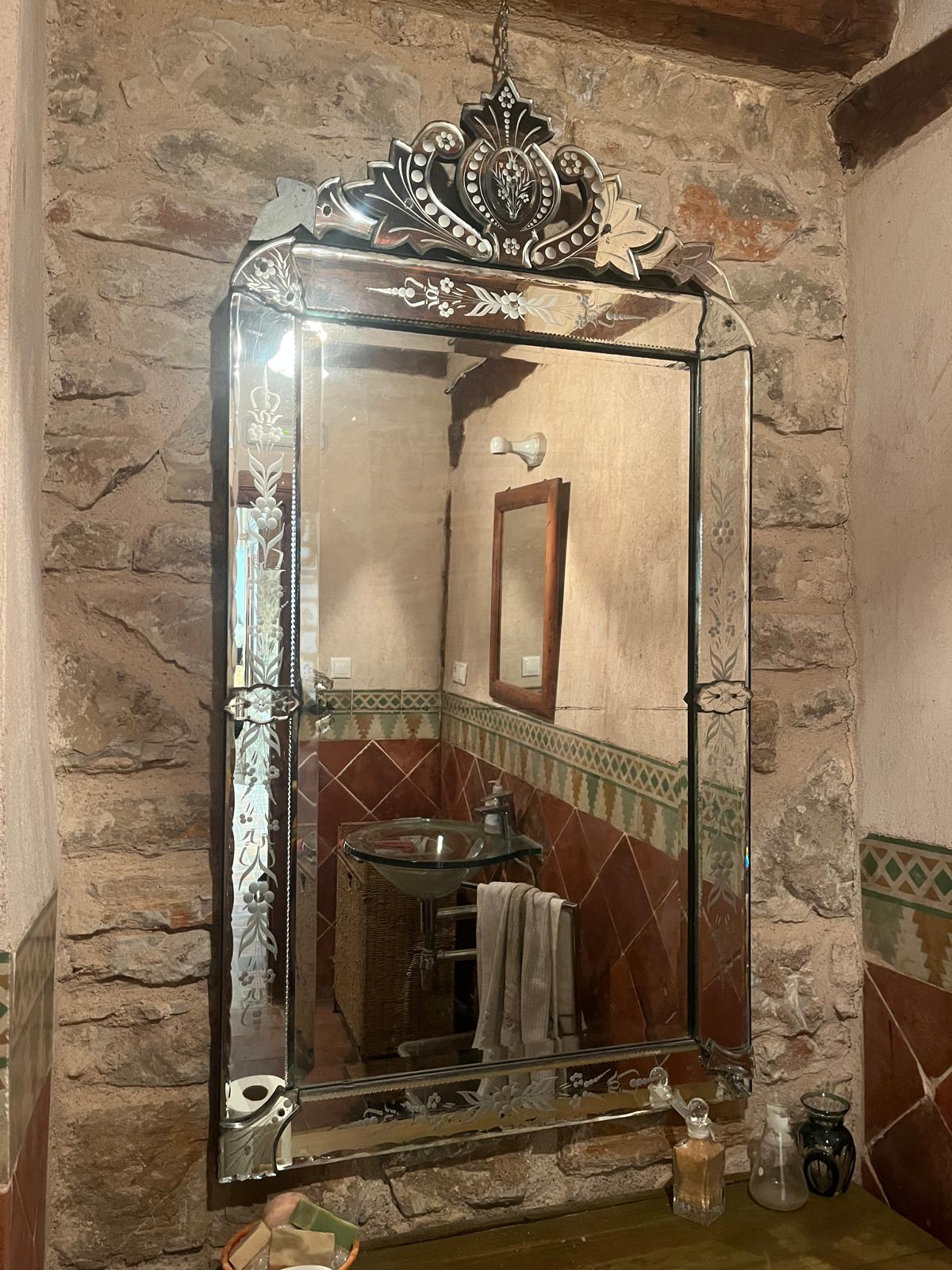 Conjunto de pared compuesto por un espejo de estilo veneciano del siglo XIX y dos apliques de cristal, procedentes y adaptados de una lámpara de araña.