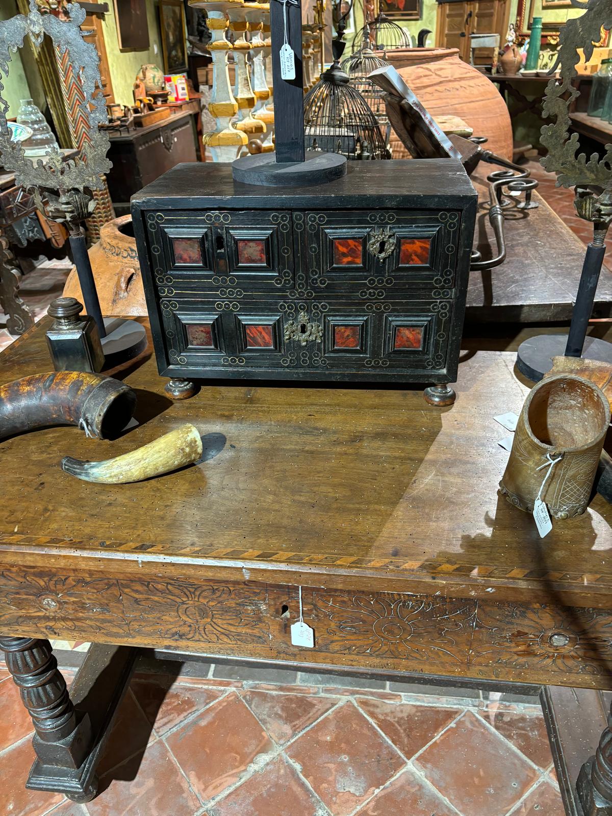 Bargueño aragonés de nogal del siglo XVIII, compuesto de 3 cajoncitos con bocallave de bronce y frentes decorados con marquetería de latón y concha de carey.