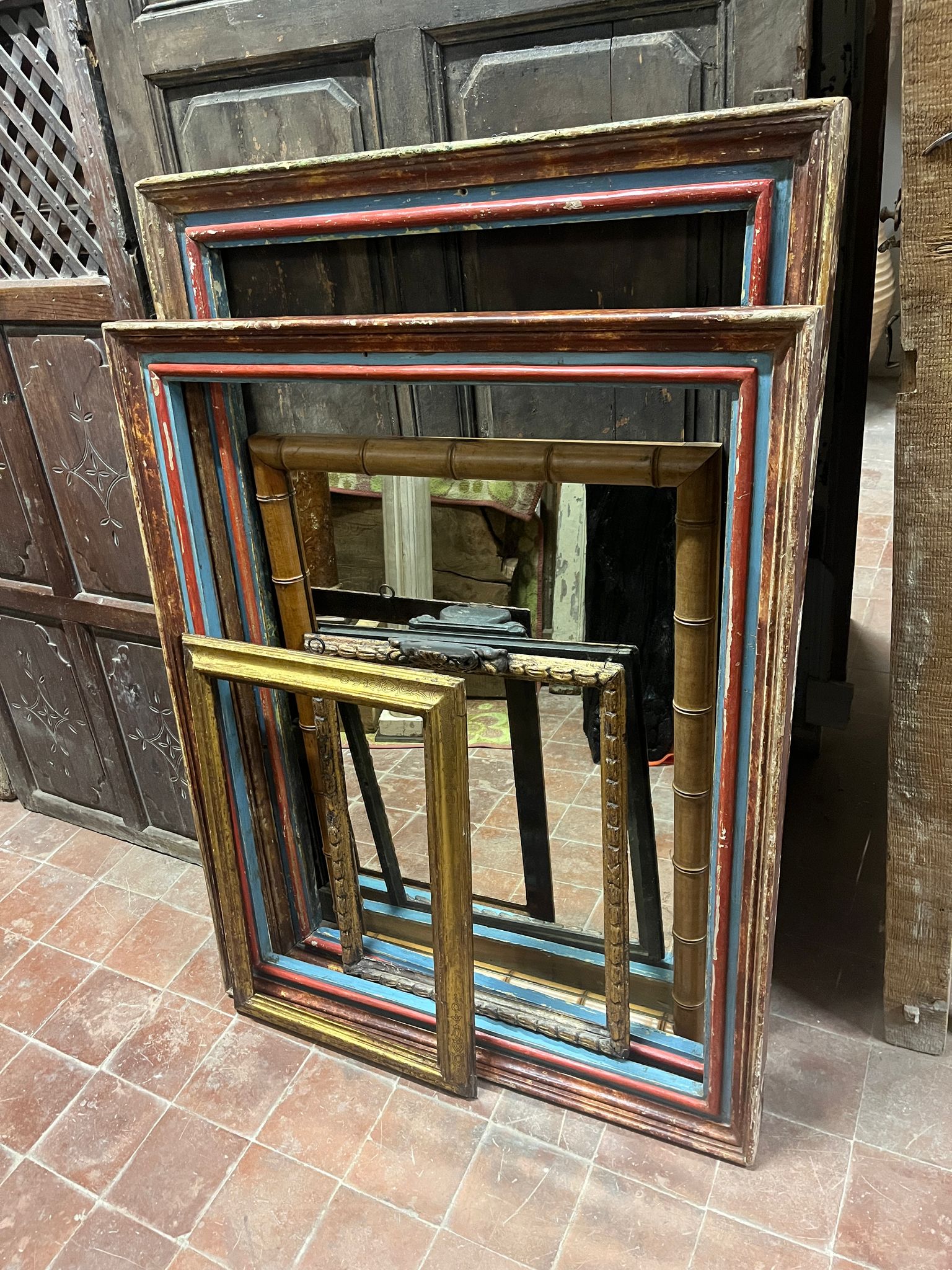 Colección de 4 marcos antiguos del siglo XVIII. La composición la conforman una pareja de predelas policromadas en azul, rojo y replica de mármol; un marco de caña fina dorado con siluetas cinceladas en las esquinas; y una antigua puertecita de altar cuyas tallas representan la flor de loto.
