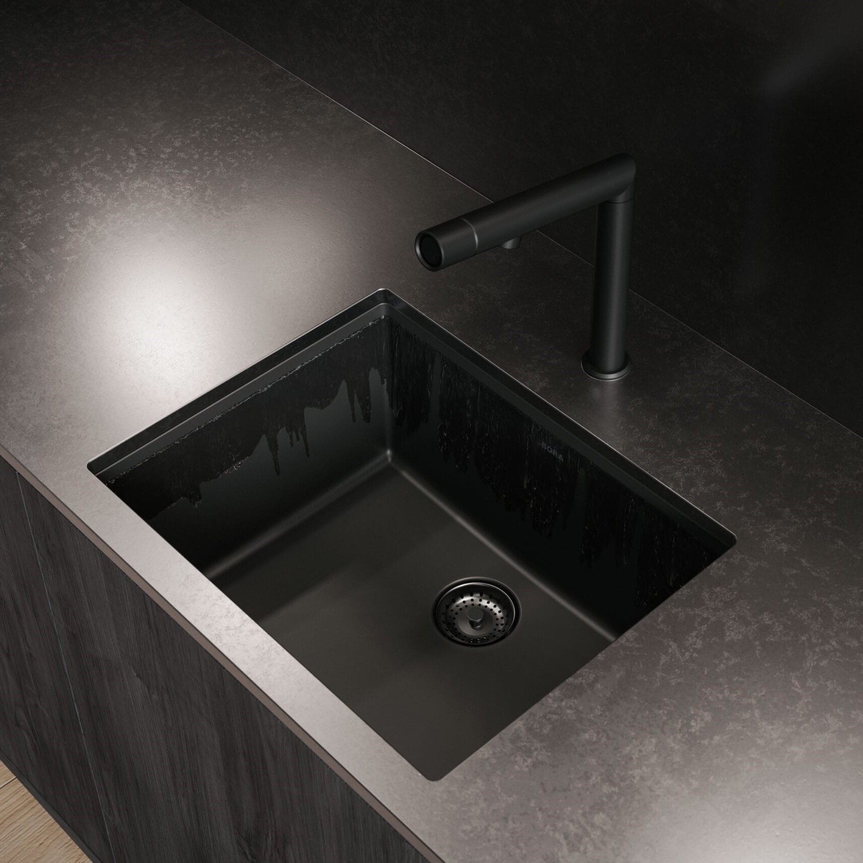 Limpieza automática. El fregadero BORA Sink se limpia simplemente pulsando un botón. Las impurezas y la suciedad de todas las superficies se enjuagan con agua sin dejar residuos. El fregadero y el grifo de color negro intenso encajan a la perfección en la filosofía de diseño de BORA.
