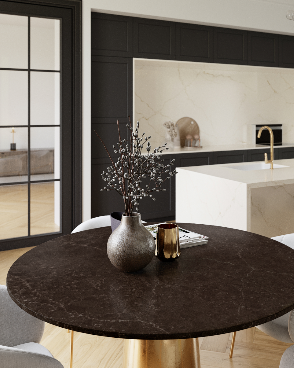 Silestone es la superficie mineral híbrida baja en sílice, fabricada con minerales premium y materiales reciclados. El color Château Brown es un sutil jaspeado con una elegante base en marrón oscuro se llena de luminosidad gracias a los reflejos de un veteado metálico en rosa cobrizo y bronce. Una composición atrevida que conecta con los tonos tierra y con un diseño más actual.