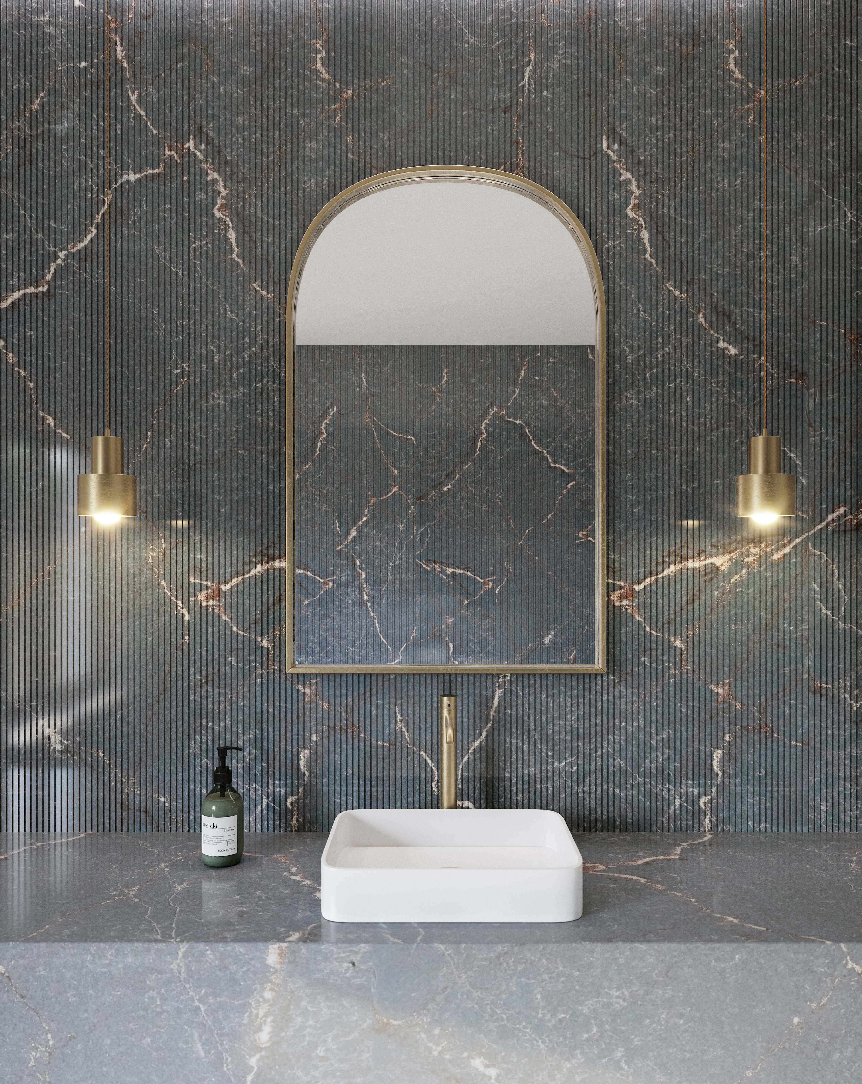 Dekton es una superficie porcelánica ultracompacta neutra en carbono con un proceso de fabricación optimizado inspirado en la belleza y estética de la piedra natural que va más allá de la naturaleza, consiguiendo las más altas prestaciones del producto. Su base crema, marcada por un patrón paralelo de vetas irregulares en tonos grises y azules, se inspira en la belleza clásica del travertino plateado romano, una de las piedras que marcó la arquitectura de la Ciudad Eterna y que hoy llena de personalidad proyectos de interiorismo y arquitectura de líneas contemporáneas.