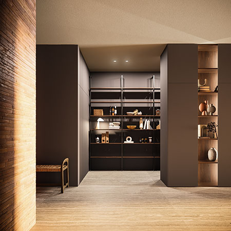 Una estancia carente de paredes, pero con infinitas posibilidades. Las columnas que delimitan la zona de la despensa la convierten en el espacio del corazón. Los alimentos desaparecen tras las puertas. Quedan a la vista la vajilla y los objetos que nutren la armonía del alma. Una estantería de emociones, para vivirla cada día.