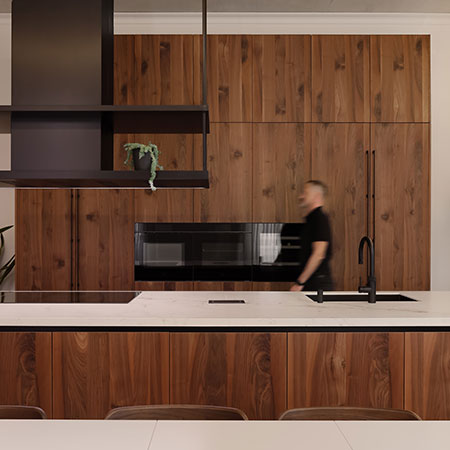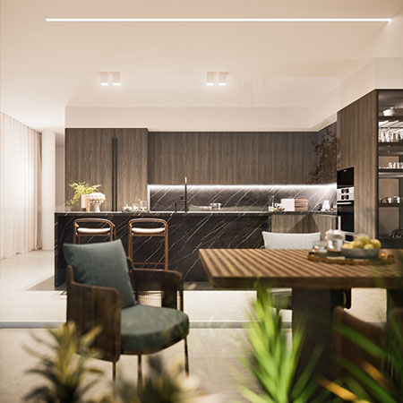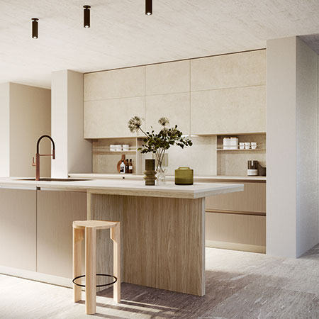 El verdor vegetal domina la arquitectura. Penetra también en los apartamentos que desafían el cielo para dar respiro, frescor y notas de colores relajantes. Tiene un eco en acabados a tono, como el aspecto pétreo de las superficies en laminado HPL Dark Pulpis y el amaderado del Synchroface olmo Grigio, y se refleja en las vitrinas con traseras de metacrilato. El bloque de la cocina en ángulo es monolítico, cerrado en los extremos por columnas, dotadas de tiradores verticales en el espacio de refrigeración.