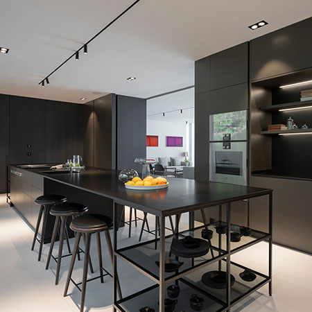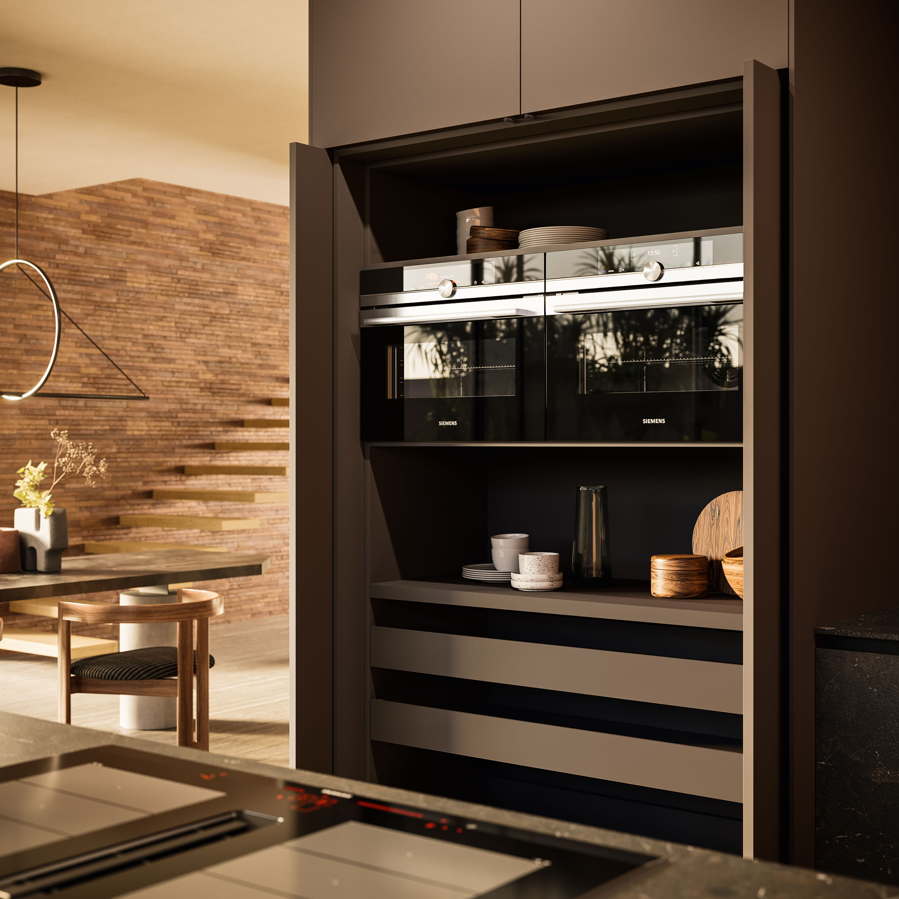 Las imponentes columnas definen el ambiente en áreas funcionales. La cocina se convierte así en un lugar de convivencia, para ser experimentada en toda su esencia. Mientras, las puertas escamoteables ocultan los electrodomésticos y las áreas operativas. Las cocinas componibles modernas se caracterizan a menudo por las aperturas con gola, es decir la ausencia de tirador. En realidad los sistemas de apertura de los muebles de la cocina ofrecen distintas variantes, de elegirse por su estética y por la funcionalidad.