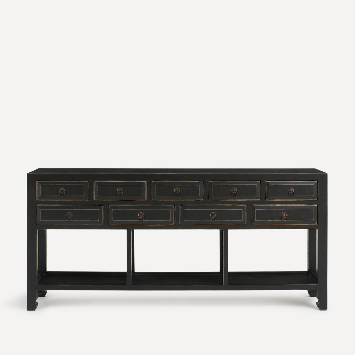 Aparador de madera de pino reciclado Pekín. Consola fabricada en pino reciclado. Lleva 9 cajones con tiradores metálicos que se abren sin guía y un gran hueco inferior. Un mueble con un look exótico y diferentes formas de almacenaje y ordenación. Medidas: 185 (ancho) x 40 (fondo) x 85 (alto) cm