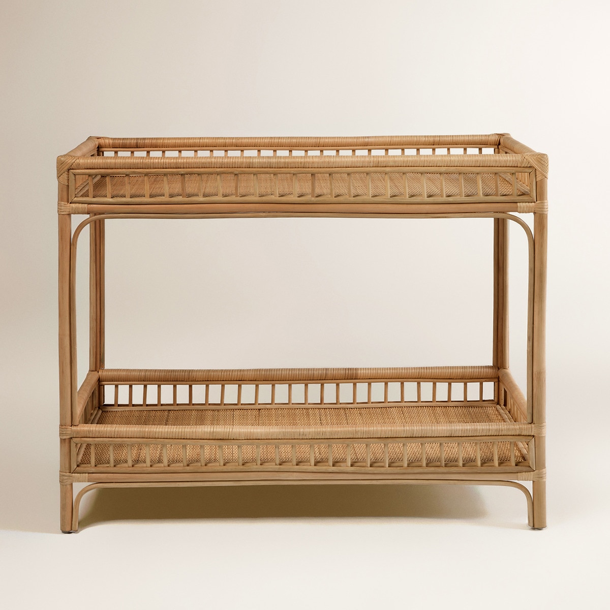 Consola de la serie Ariel, realizada en ratán, un material natural y ligero que aportará un estilo cálido a cualquier espacio. Un mueble que por su diseño es ideal para usar como mueble bar. Medidas: 100 (ancho) x 80 (alto) x 45 (largo) cm