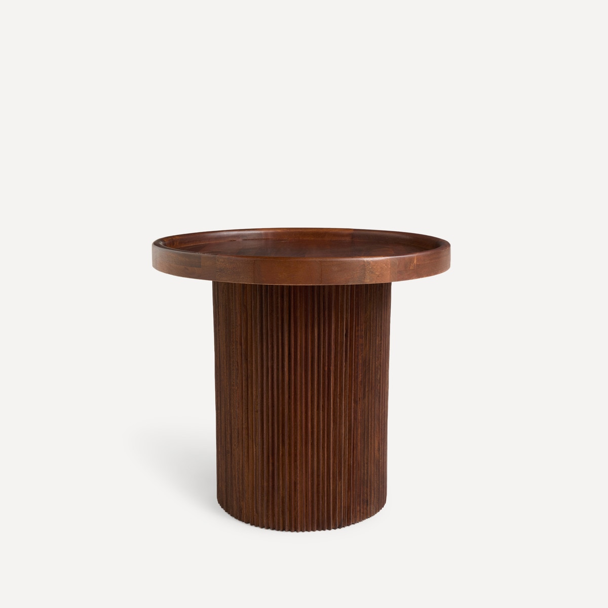 Mesa auxiliar redonda fabricada en madera de mango. Cuenta con una pata central redonda con diseño de listones. La serie Curve ofrece muebles con un diseño muy actual con materiales naturales y formas curvas. Medidas: 55 (ancho) x 60 (alto) x 55 (largo) cm