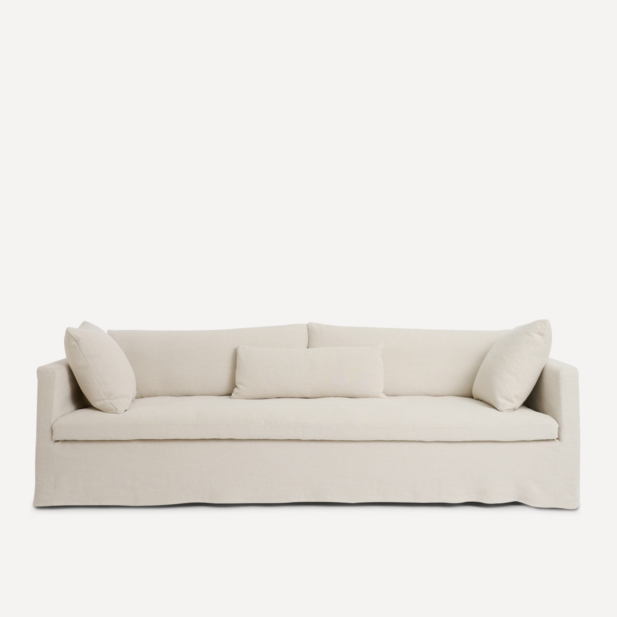 Sofá de 4 plazas con estructura de madera y tapicería de lino. Cuenta con un diseño amplio y elegante basado en líneas rectas y sencillas, totalmente desenfundable con sentada única y reposabrazos estrechos.