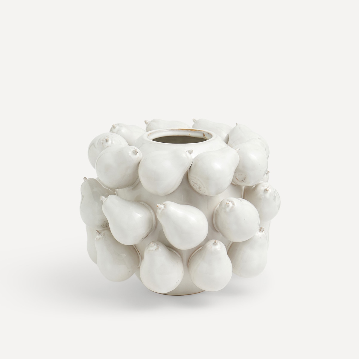 Jarrón decorativo realizado en porcelana, decorado con figuras de peras. Un elemento decorativo muy original para poner tus flores o para usar como centro de mesa. Medidas: 28 (ancho) x 27,8 (largo) x 22 (alto)