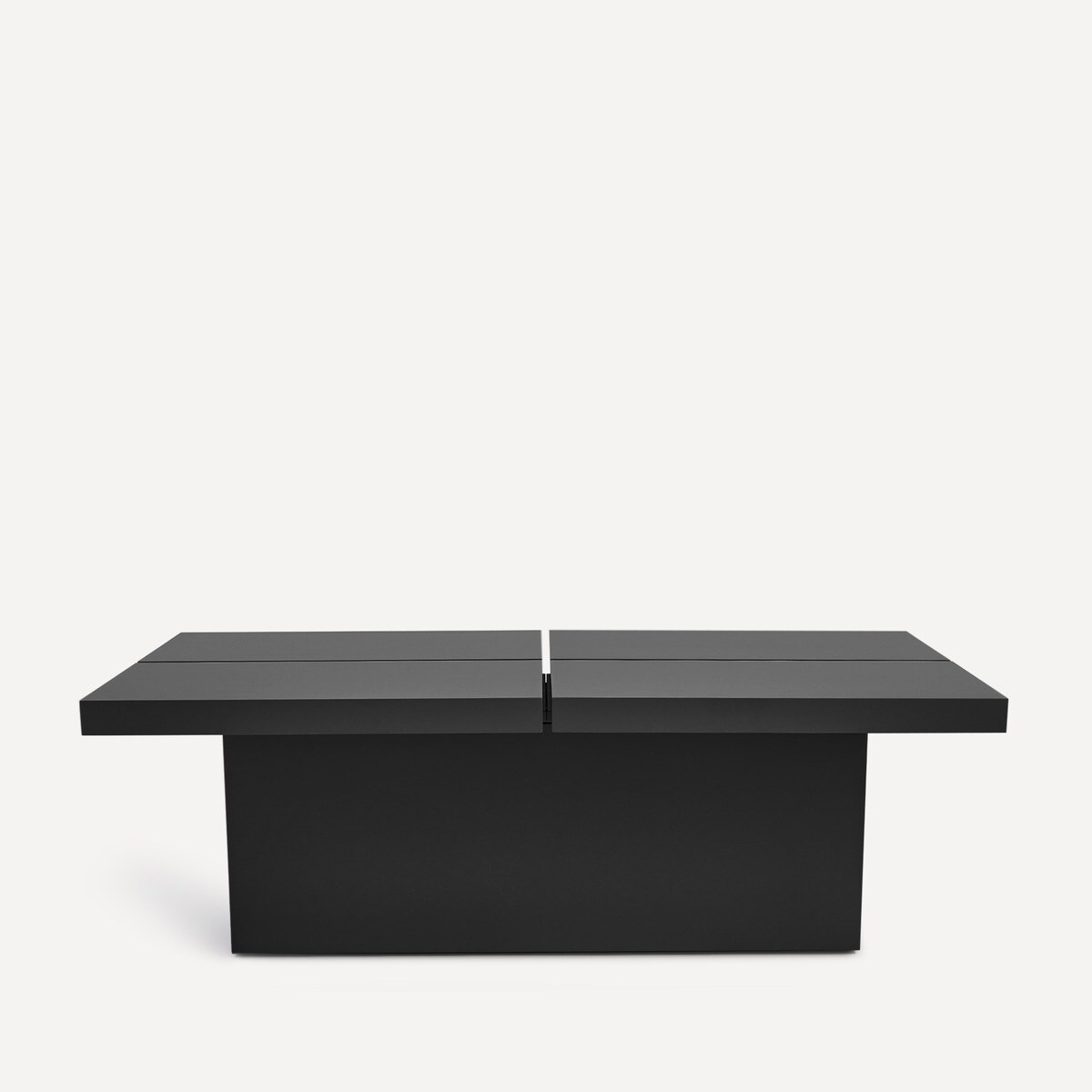 Mesa de centro hecha en MDF lacado con acabado en mate. Tiene diseño de inspiración italiana de 4 cuadrantes y mecanismo de apertura mediante guías sincronizadas con cable de acero. La base central de la mesa es hueca, ofreciendo una gran capacidad de almacenaje en su interior. Dispones de dos tipos de acabado: en mate o en alto brillo