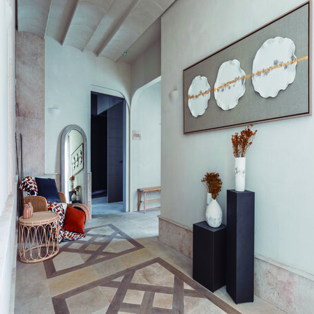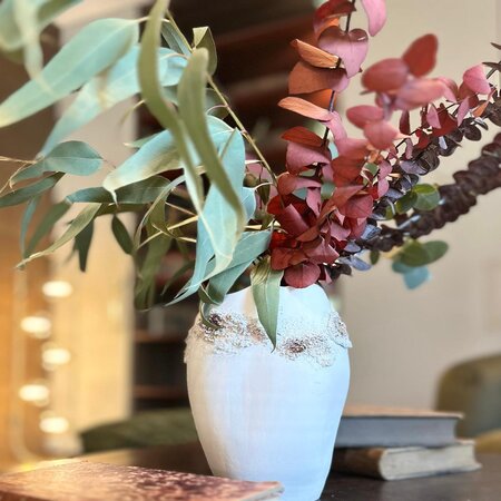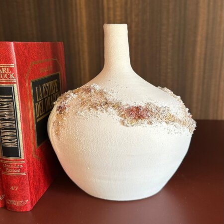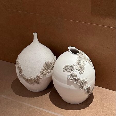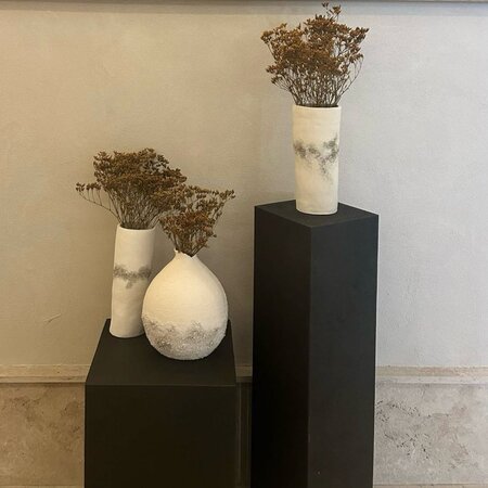 Jarrones 100% realizados a mano en loza blanca con texturas, combinando técnica mixta de cerámica con pintura acrílica y texturas. Los jarrones pueden ser también en arcilla roja/terracota o en gres beige, pudiendo adaptar los colores y formas al ambiente del espacio.