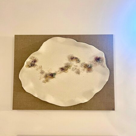 Plancha de porcelana chamotada blanca realizada a mano 100%, sobre lienzo de lino natural, sin enmarcar, combinando técnica mixta de cerámica con pintura acrílica y texturas. Los cuadros pueden se pueden adaptar en colores, incluso en número de planchas con lienzos de gran formato, al ambiente del espacio.