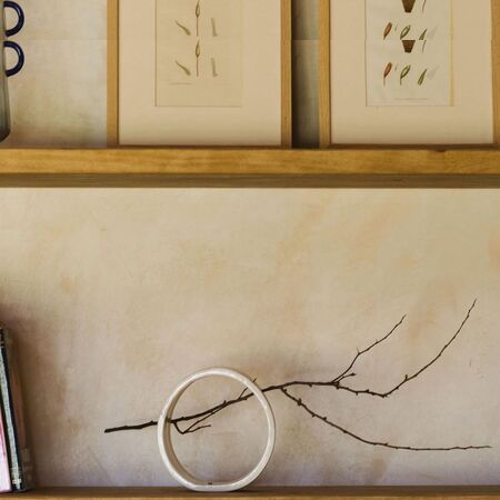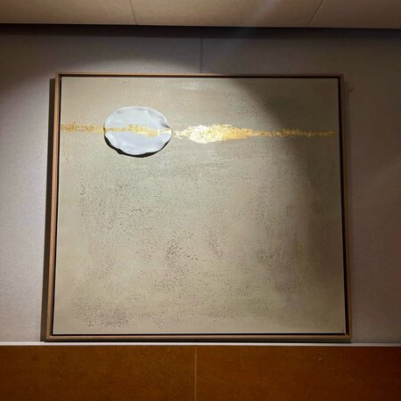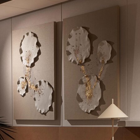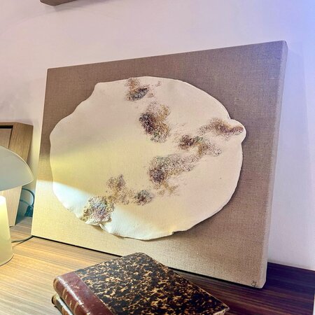 Planchas de porcelana chamotada blanca realizadas a mano 100%, sobre lienzo de lino natural, enmarcada en caja americana de roble, combinando técnica mixta de cerámica con pintura acrílica, texturas y pan de oro. Los cuadros pueden se pueden adaptar en colores, incluso en número de planchas con lienzos de gran formato, al ambiente del espacio.