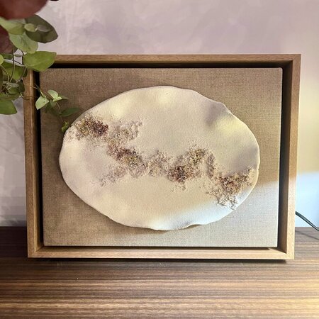 Plancha de porcelana chamotada blanca realizada a mano 100%, sobre lienzo de lino natural, enmarcada en caja americana de roble, combinando técnica mixta de cerámica con pintura acrílica y texturas. Los cuadros pueden se pueden adaptar en colores, incluso en número de planchas con lienzos de gran formato, al ambiente del espacio.