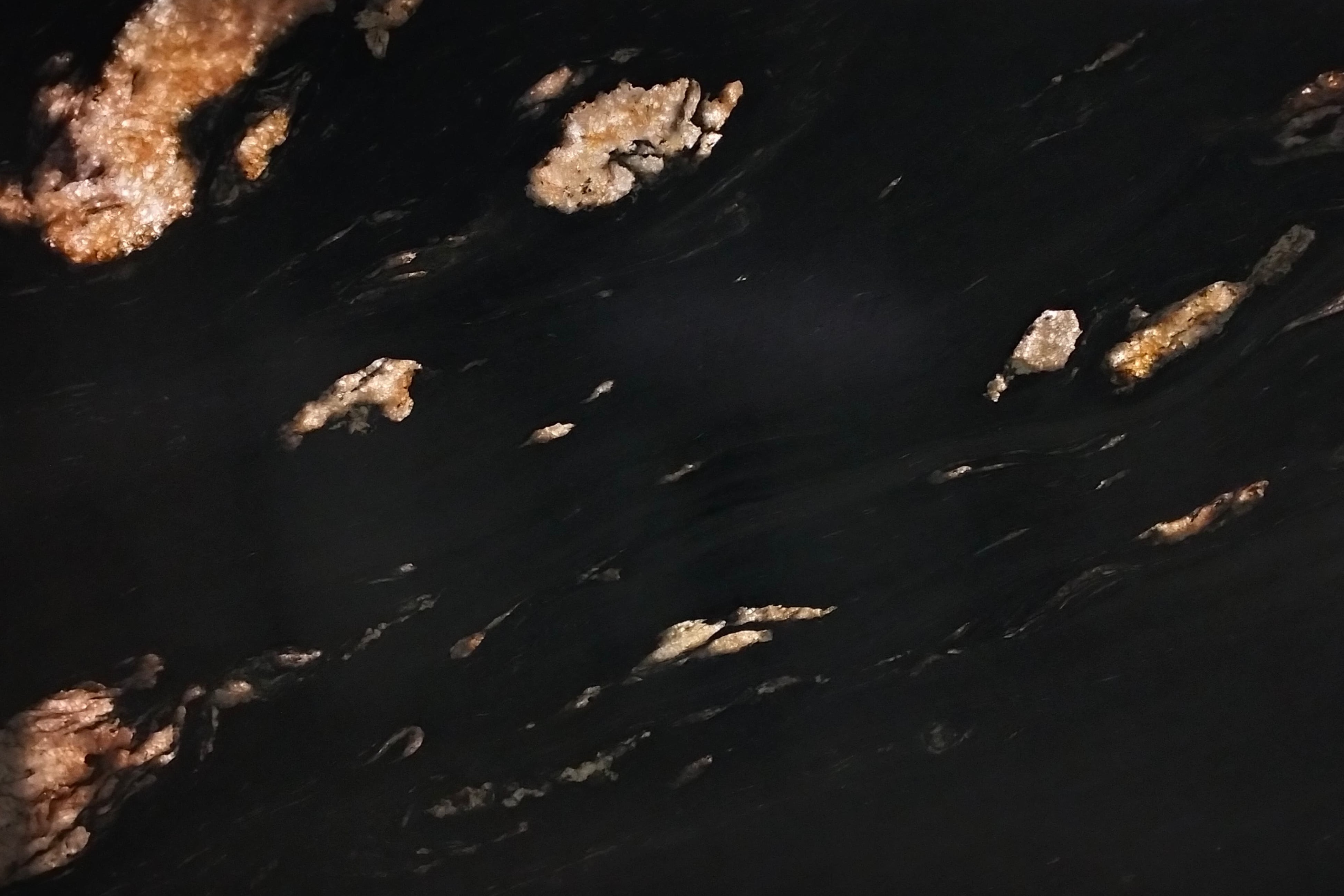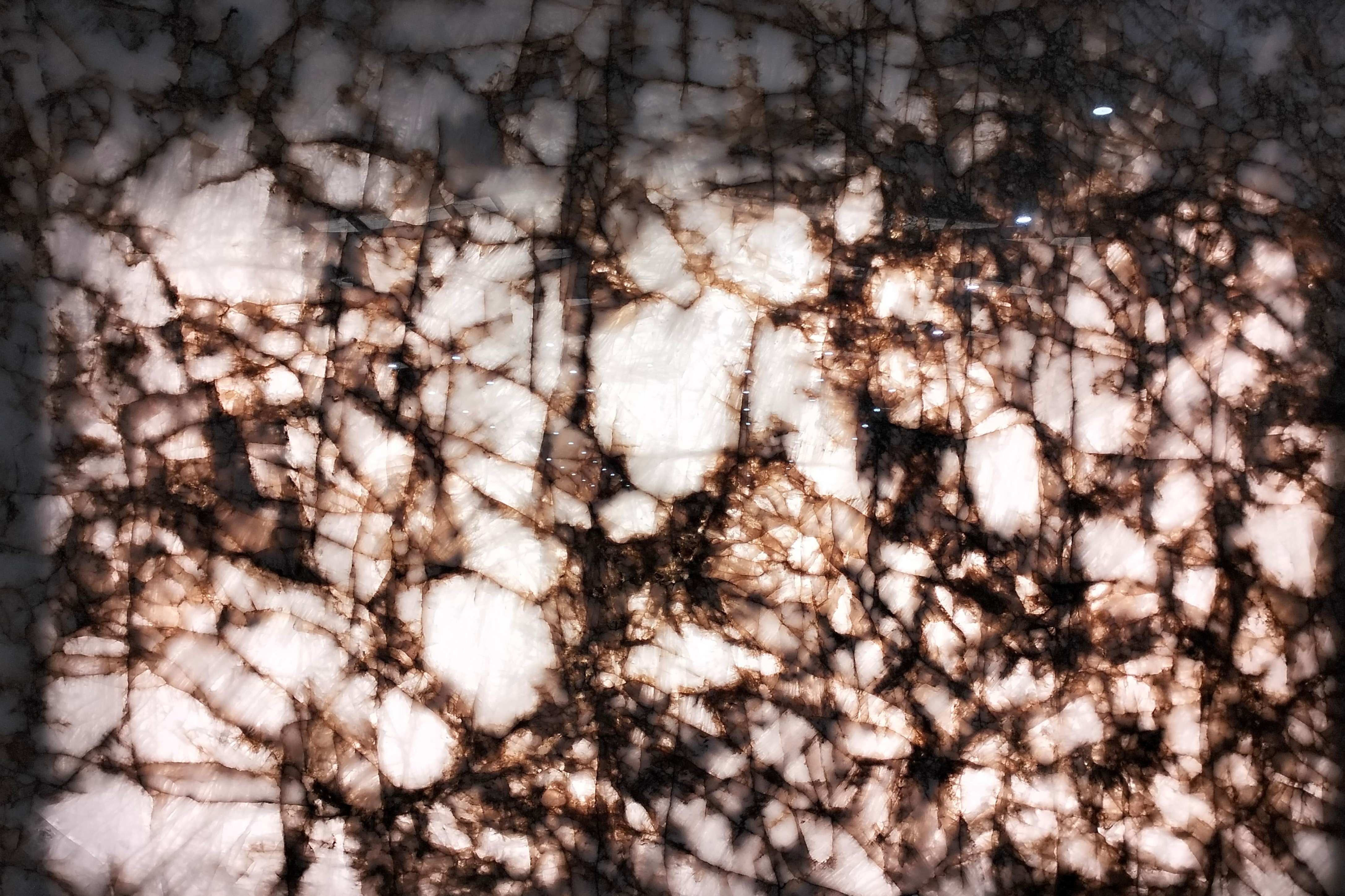 El material Crystallo Earth se aplica en dos piezas fundamentales de la zona oscura, la pieza del centro y las lámparas suspendidas simulando las espectaculares estalacticas que podemos encontrar en las cuevas volcánicas.