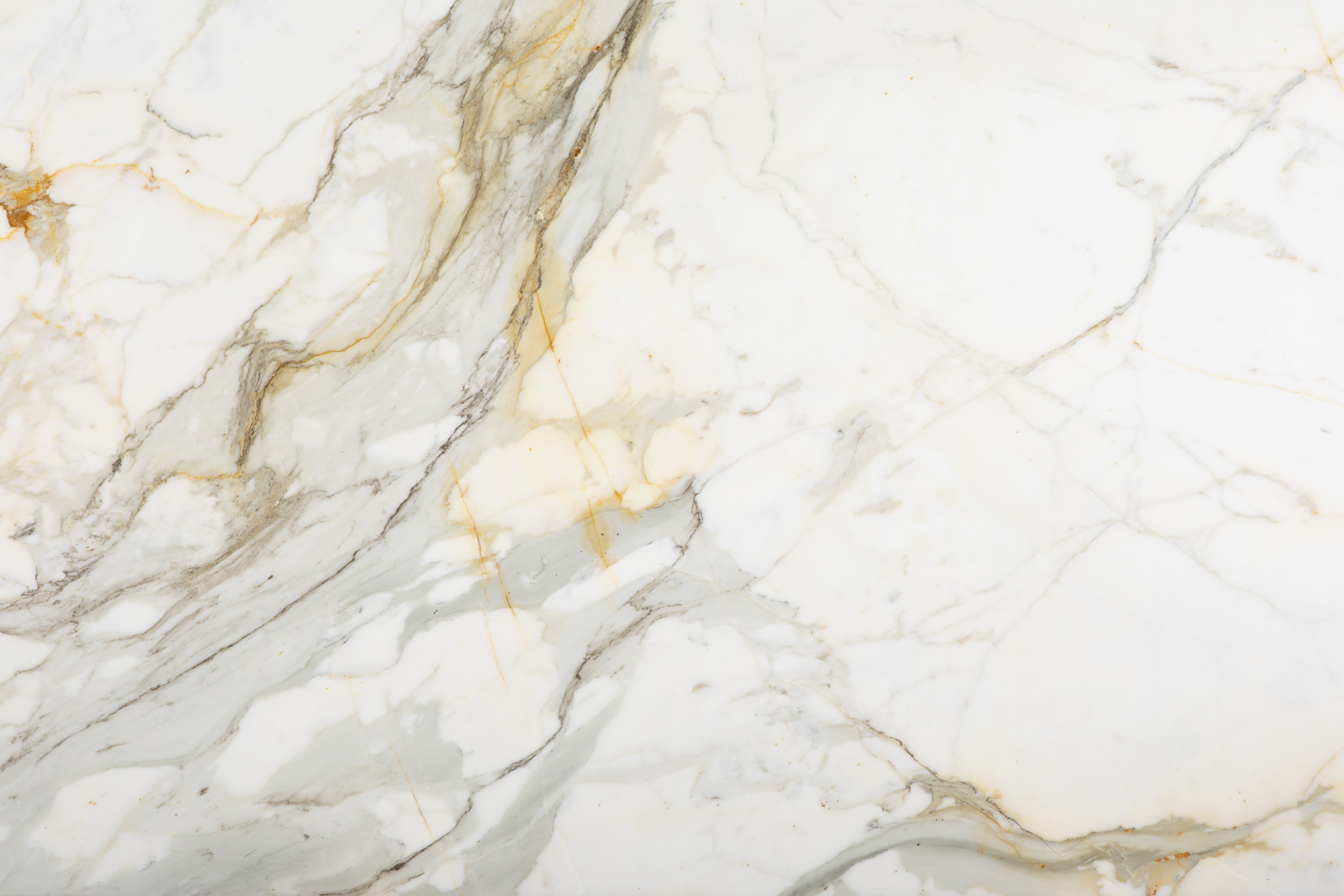 Mármol italiano Calacatta Oro aplicado en el pavimento, la isla y las baldas de la estanteria de cocina.