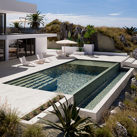Inspirándonos en la piedra de Bali de precioso color verde esmeralda y un patrón sutilmente irregular, hemos creado este diseño en gres porcelánico que aportará una atractiva belleza natural y un acabado exótico al diseño de la piscina. Gracias a su versatilidad, se pueden buscar varias combinaciones para la coronación de la piscina y la playa o para las dos. Los diseños White Stone o Grey de la Serie Evolution y el diseño Taiga de la Serie Madera pueden ser algunos ejemplos. En el espacio Gresmanc Group por Fran Cisneros se ha usado bases 625x310x10 mm cortadas a 310x310 mm, losetas de 310x150 mm y tacos de 150x150 mm, además de piezas especiales como el peldaño recto 625x317x40mm y cantoneras.