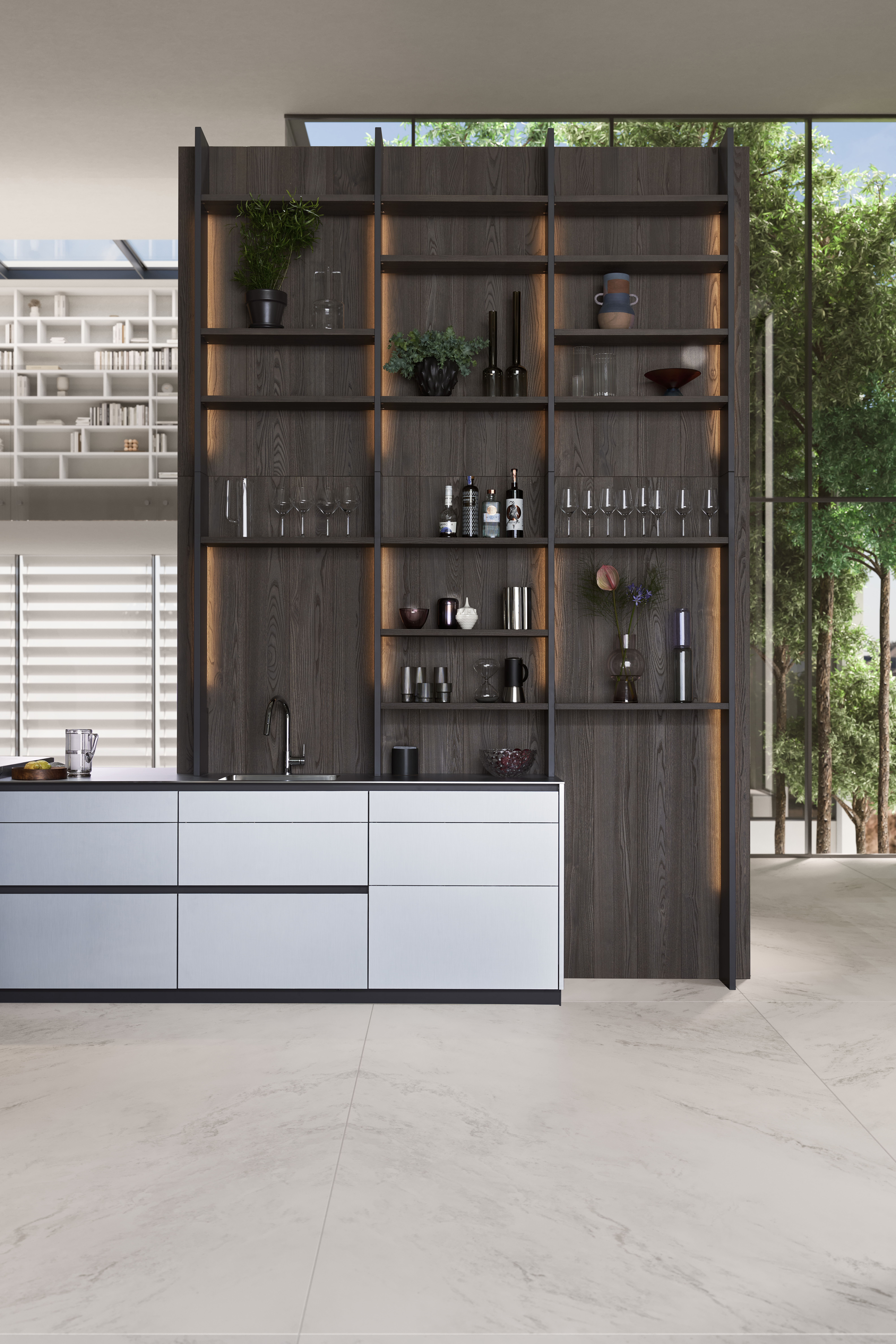El sistema de estanterías ICONIC impresiona por sus líneas definidas y su presencia arquitectónica. Con una separación mínima de 5 cm entre los laterales de la estantería y la pared, se crea un diseño moderno y ligero. Las tiras LED estratégicamente ubicadas añaden acentos adicionales y refuerzan el impacto visual del concepto. La imponente estructura ofrece infinidad de opciones de diseño personalizadas y se integra perfectamente en distintos conceptos de interiorismo.