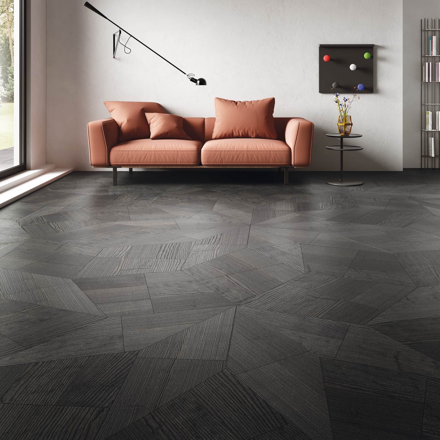 Con Slide Natural Genius por primera vez en el mundo de los suelos, se da la posibilidad al usuario final, al diseñador de interiores o a quién lo desee, de decidir el dibujo de su suelo. Se le invita a interesarse y a participar. Participación, precisamente; una vibración de esta época”. Es ésta la filosofía con la que Daniele Lago ha dado vida a Slide, la colección que combina la geometría y la matemática para generar elementos compositivos horizontales y verticales. Auténticas superficies decorativas en las que la magia de los números trascendentes transforma las formas rectangulares de las planchas comunes en rombos, para dar vida a infinitas composiciones modulares. ¿Quién dijo que la geometría no puede ser divertida?